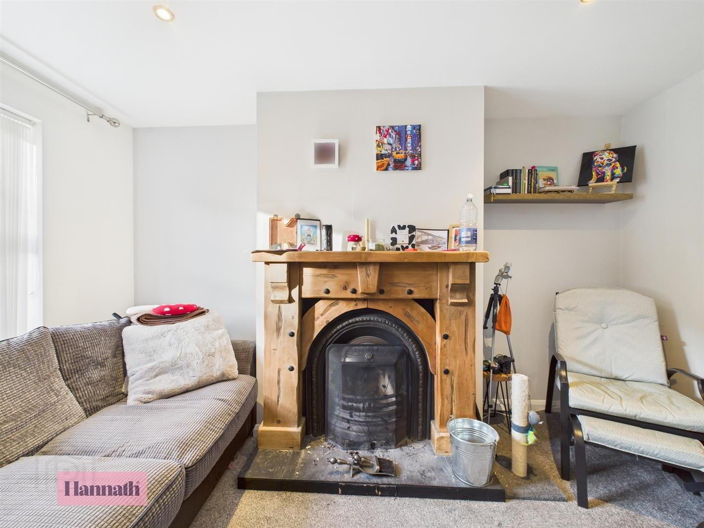Feature fireplace with open fire, in carpet, radiator