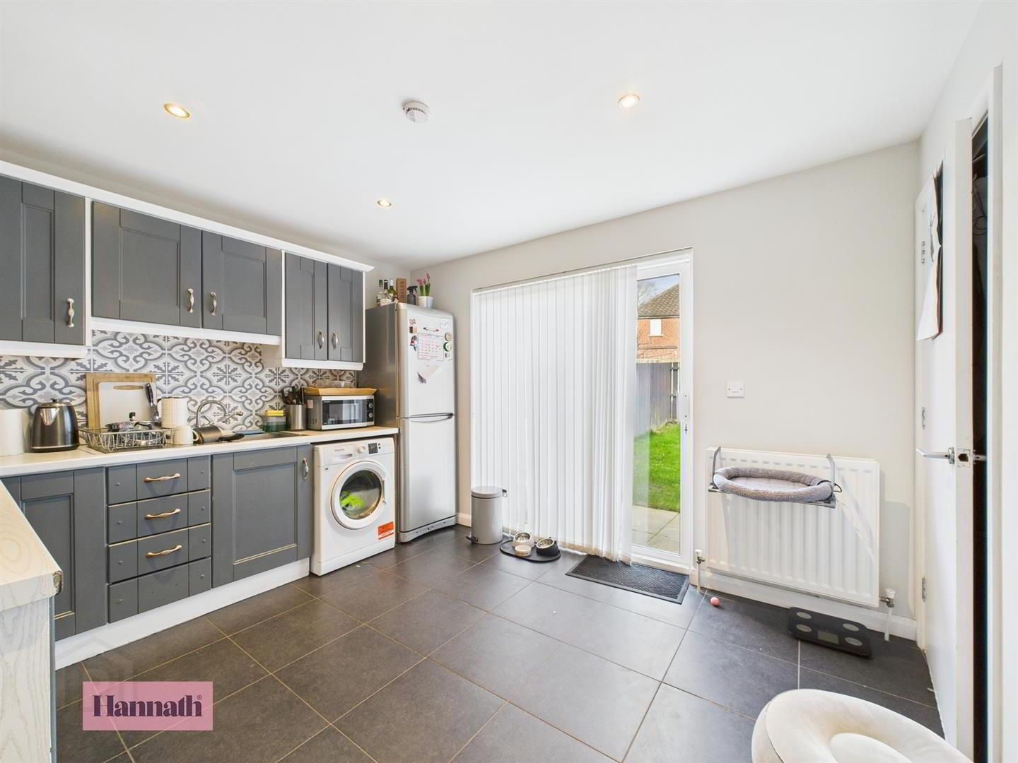 Range of high and low level units, space for fridge freezer and washing machine. Tiled flooring, double panel radiator