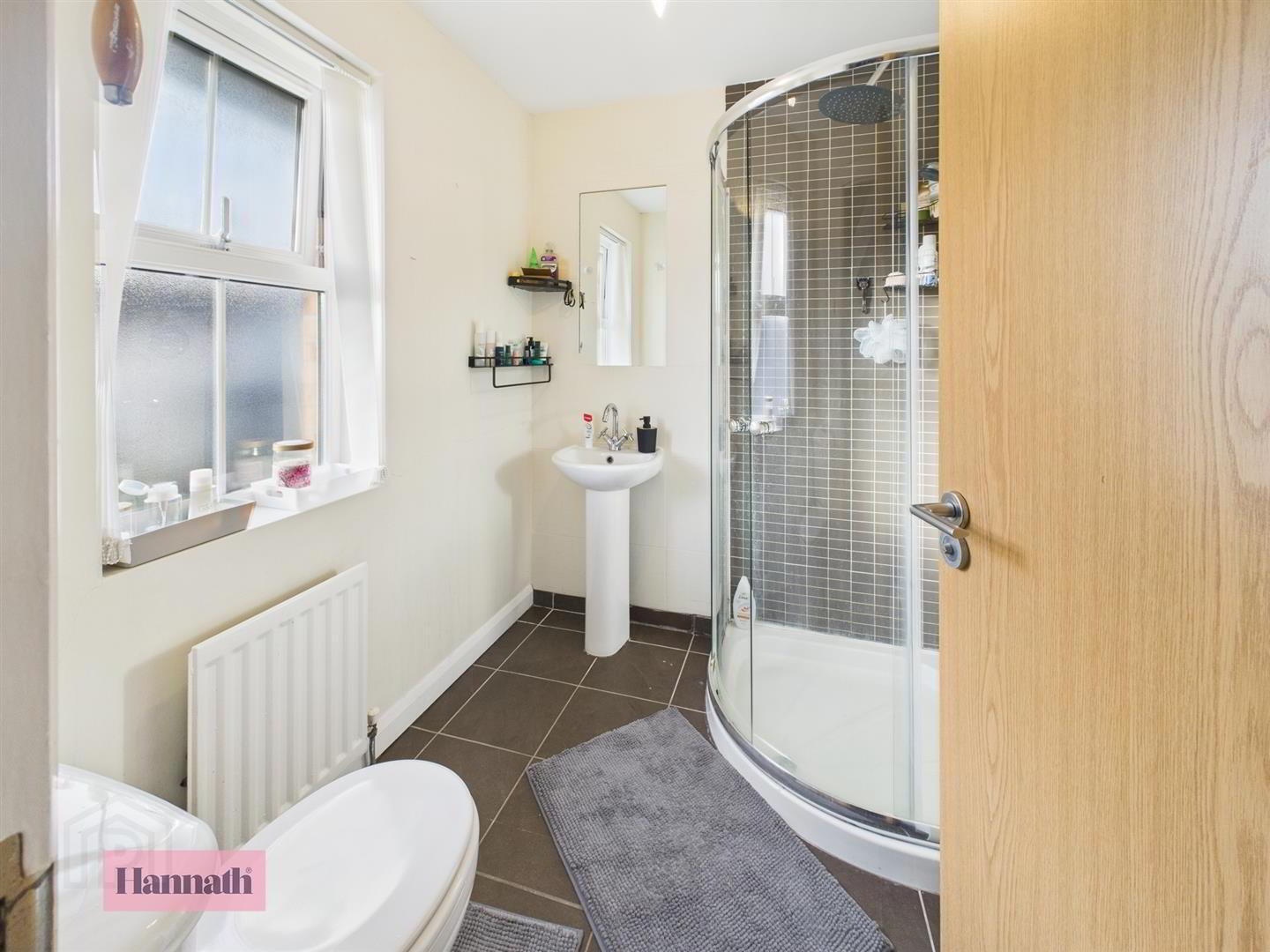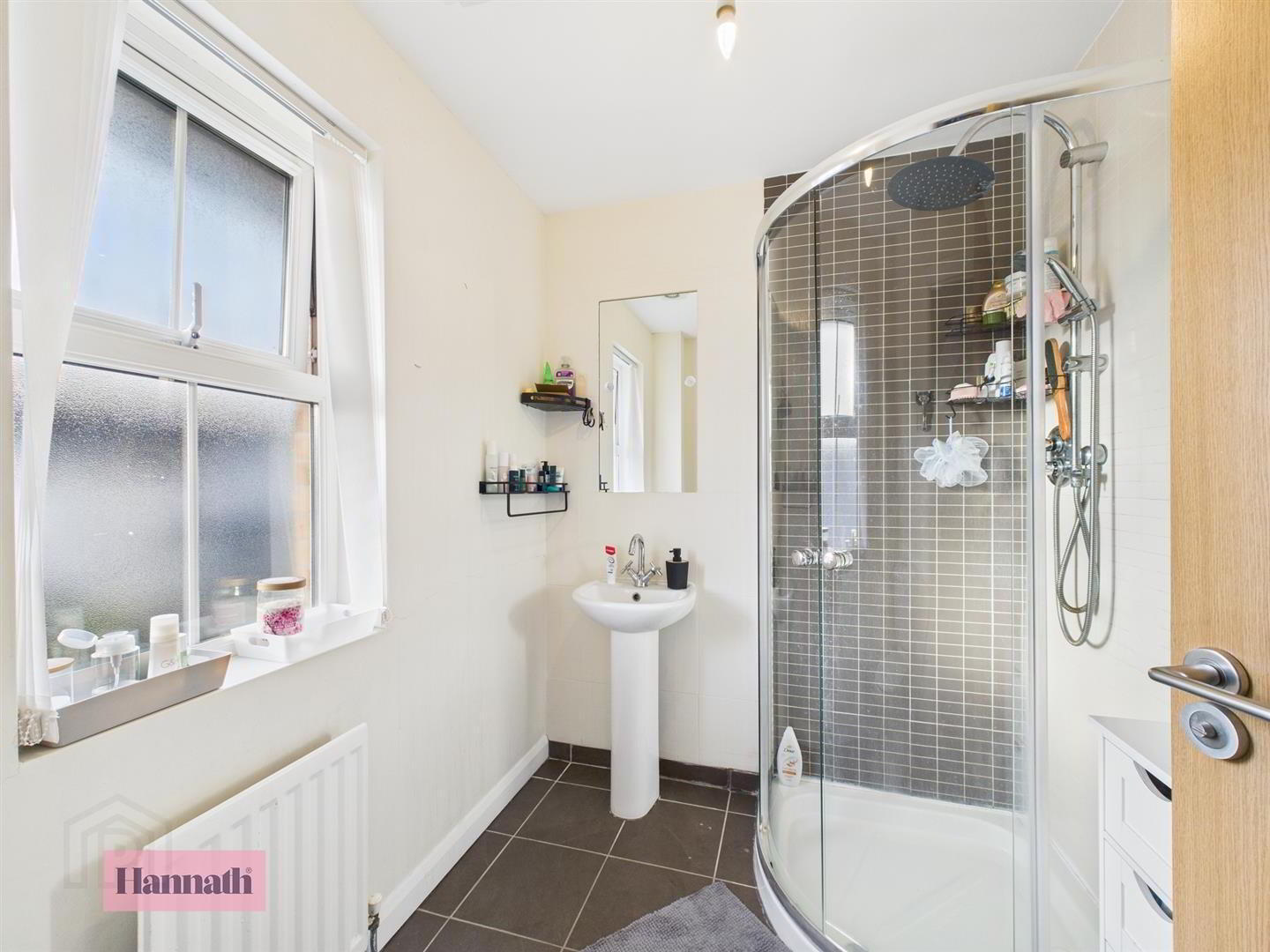 Mains shower unit, wash hand basin, w.c., tiled flooring, small single panel radiator, extractor fan.
