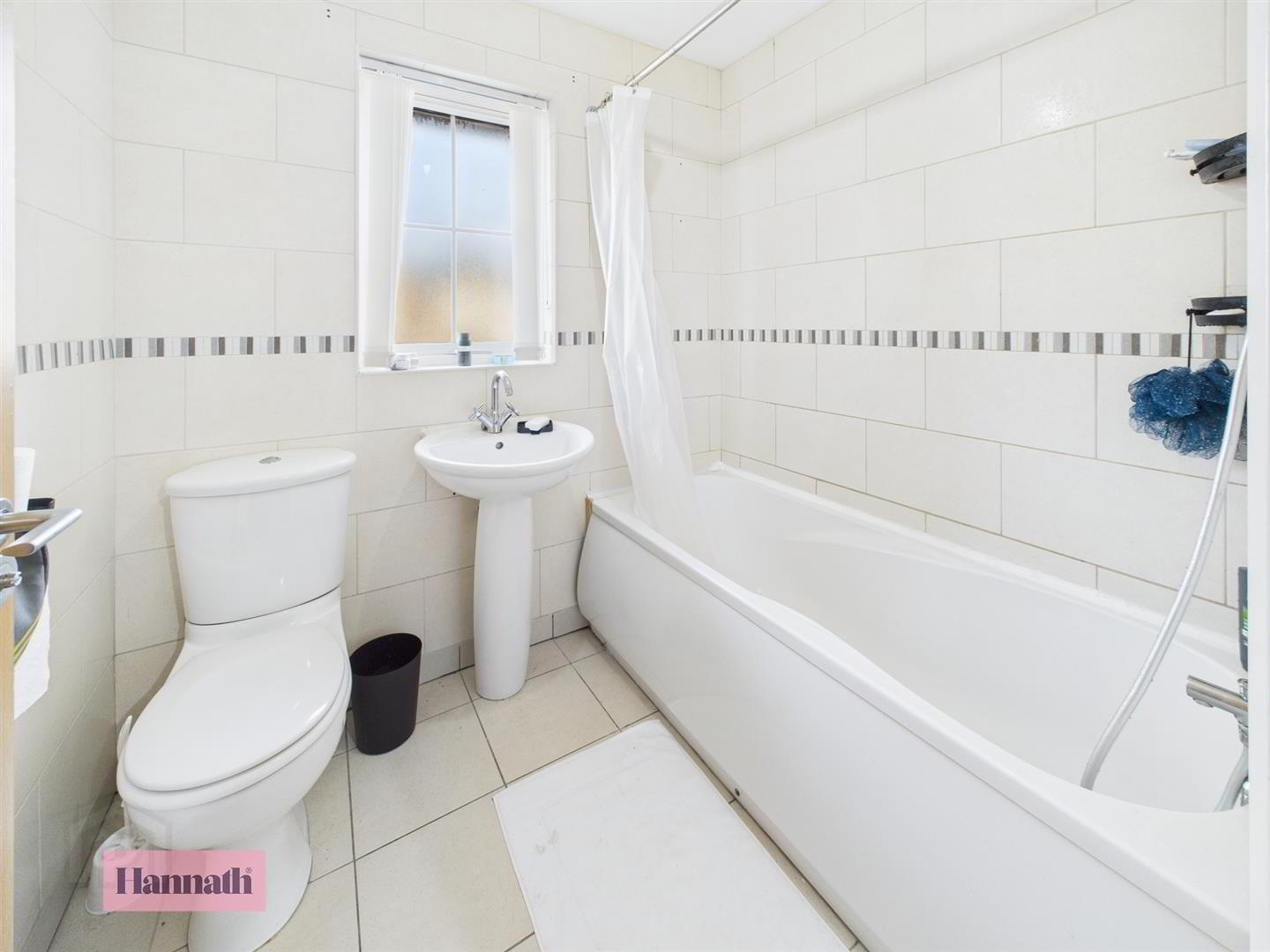 Bath with shower over, wash hand basin, w.c., tiled flooring, tiled walls, single panel radiator, extractor fan.