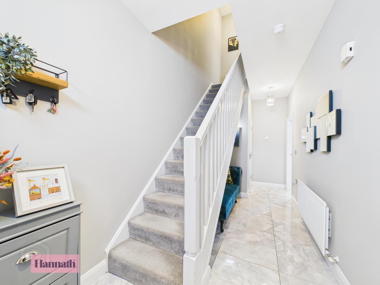 - A welcoming hallway with a neutral colour palette and glossy tiled flooring that leads to the upper floor via a carpeted staircase.