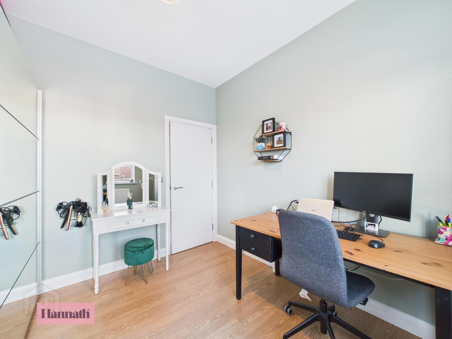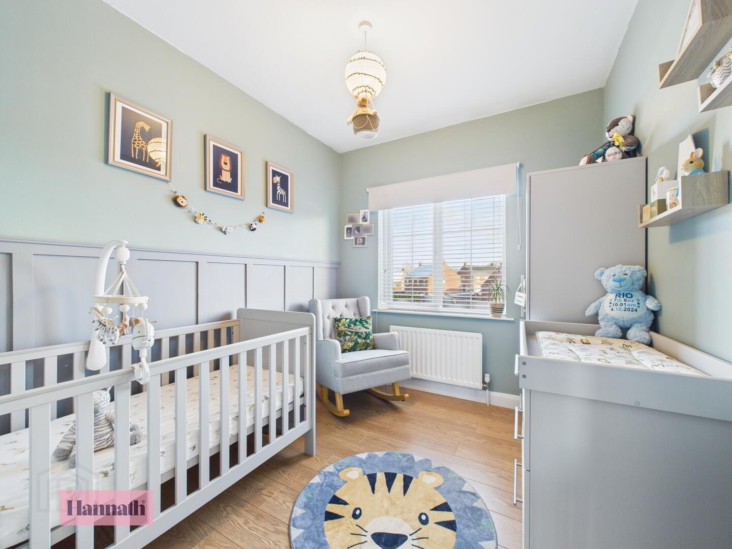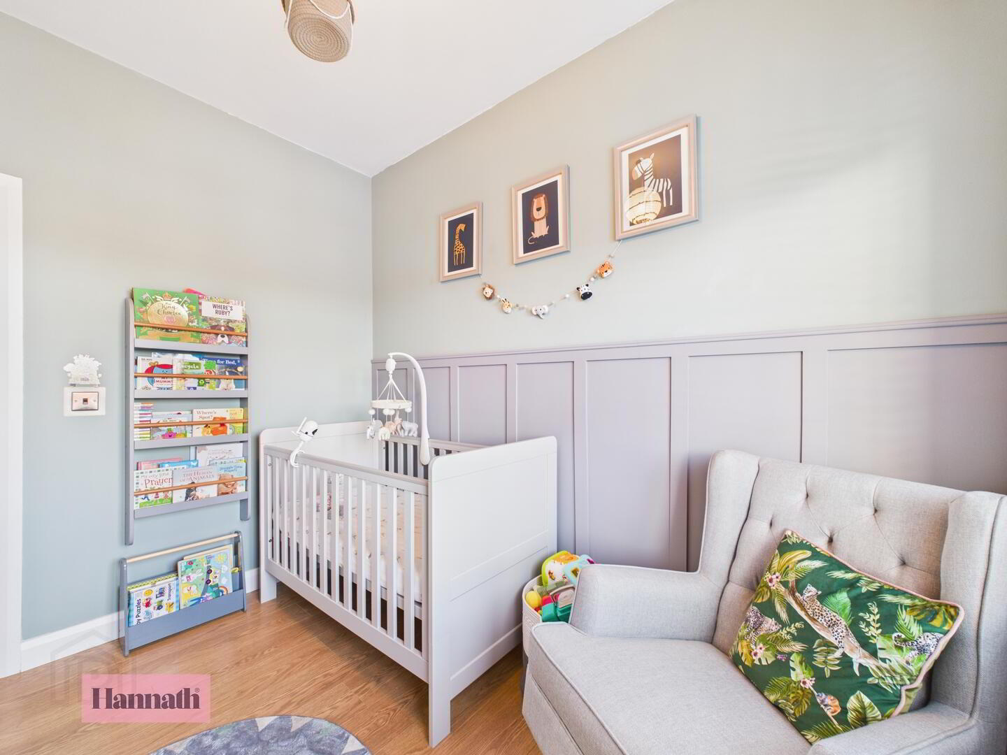 - A third bedroom designed as a nursery, featuring wood-effect flooring and soft coloured walls.