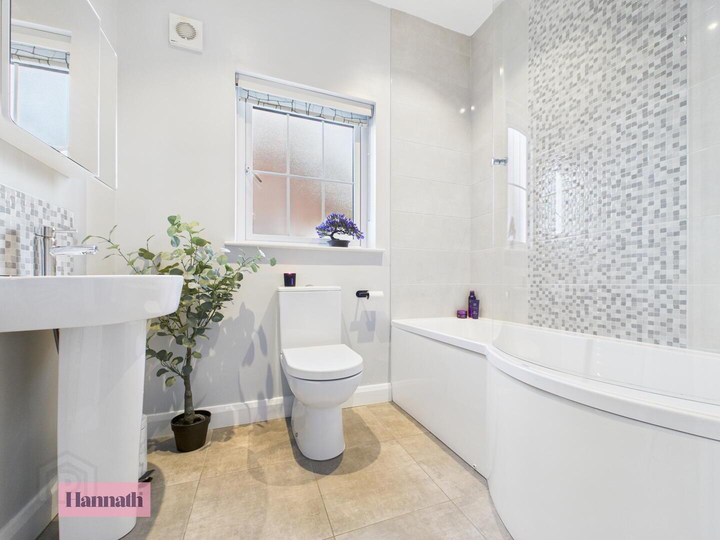 - A family bathroom fitted with a modern white suite including a toilet, basin, and a curved bathtub with a shower screen.