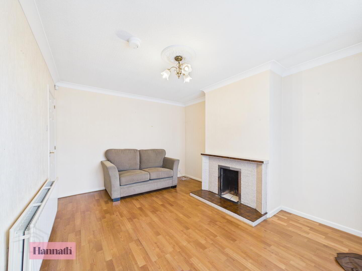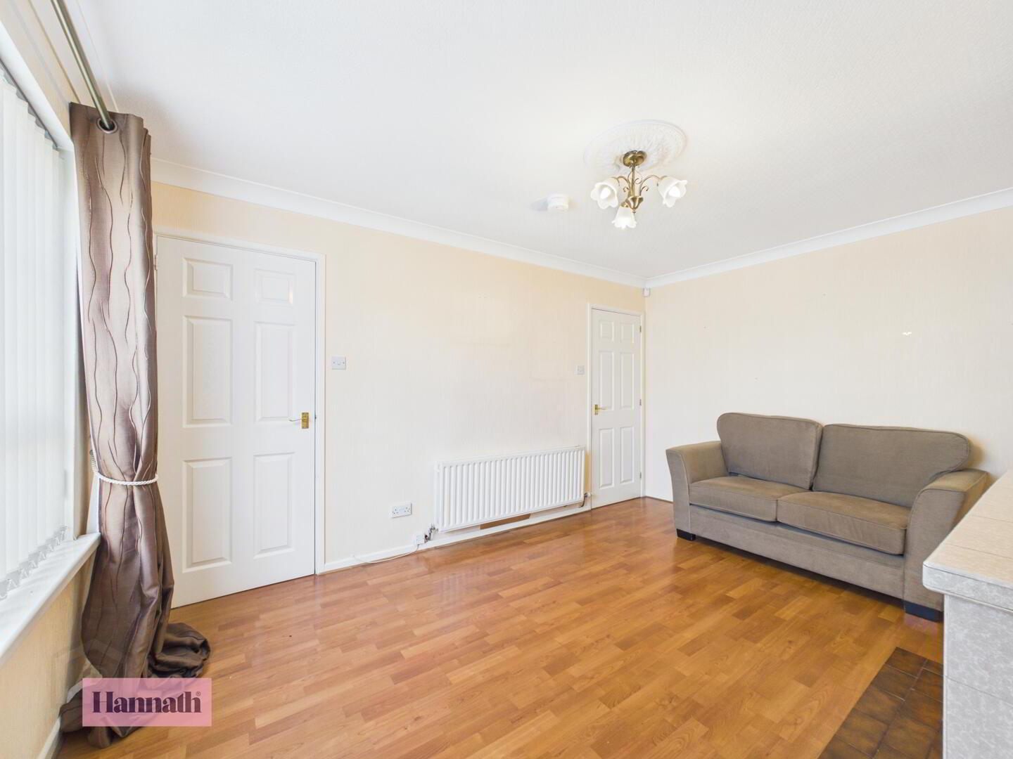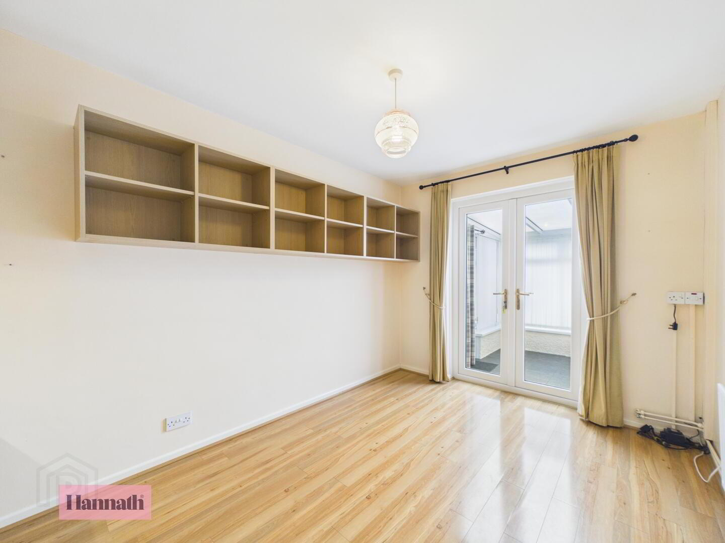 Bedroom 2 offers a bright and comfortable space with wood flooring and access through French doors to the small conservatory. The neutral décor and fitted shelving provide a versatile setting for various uses.