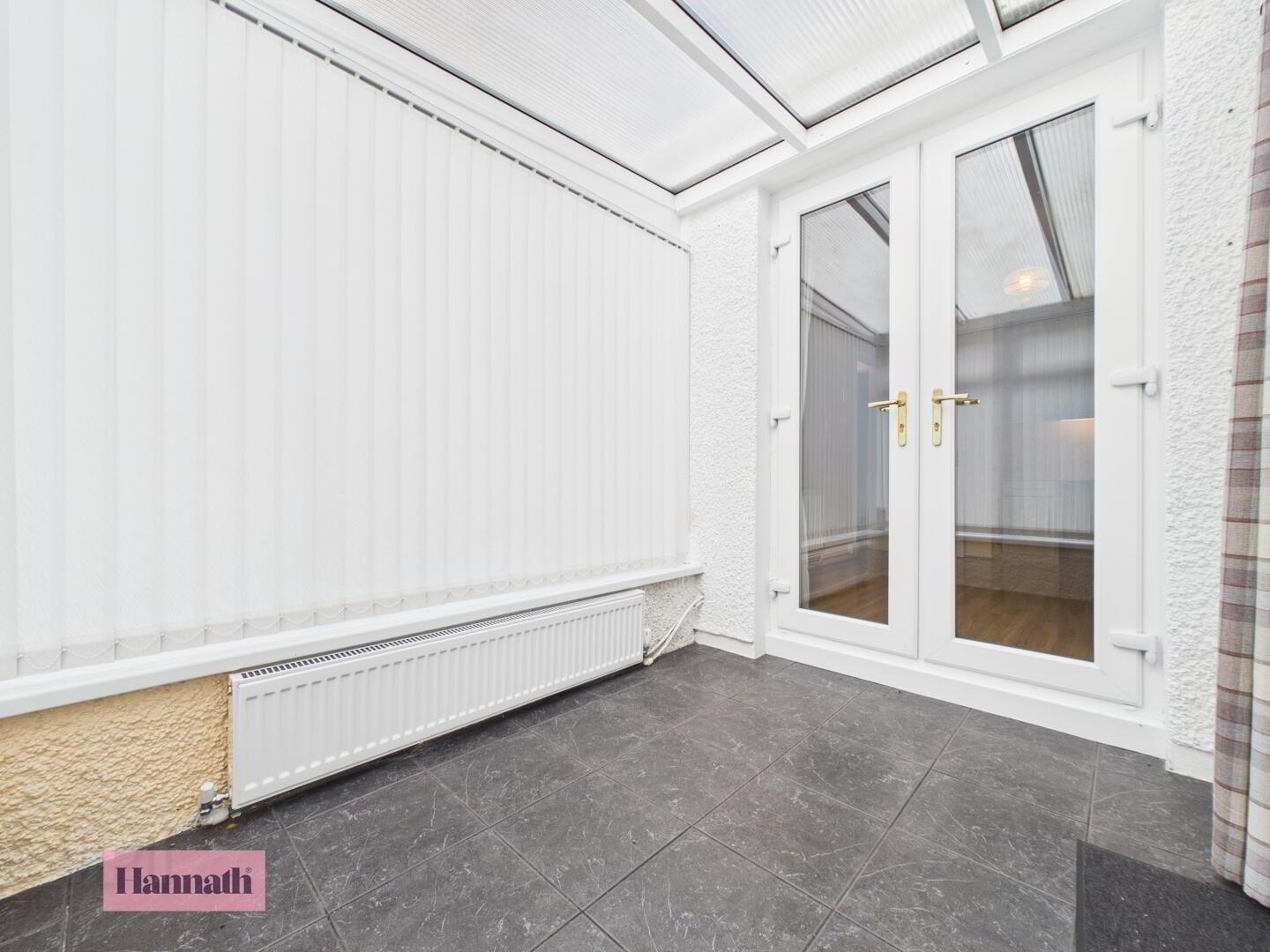 A bright conservatory with a tiled floor and large windows fitted with vertical blinds. French doors lead outside, making it a perfect spot to enjoy the garden views while being sheltered from the weather.