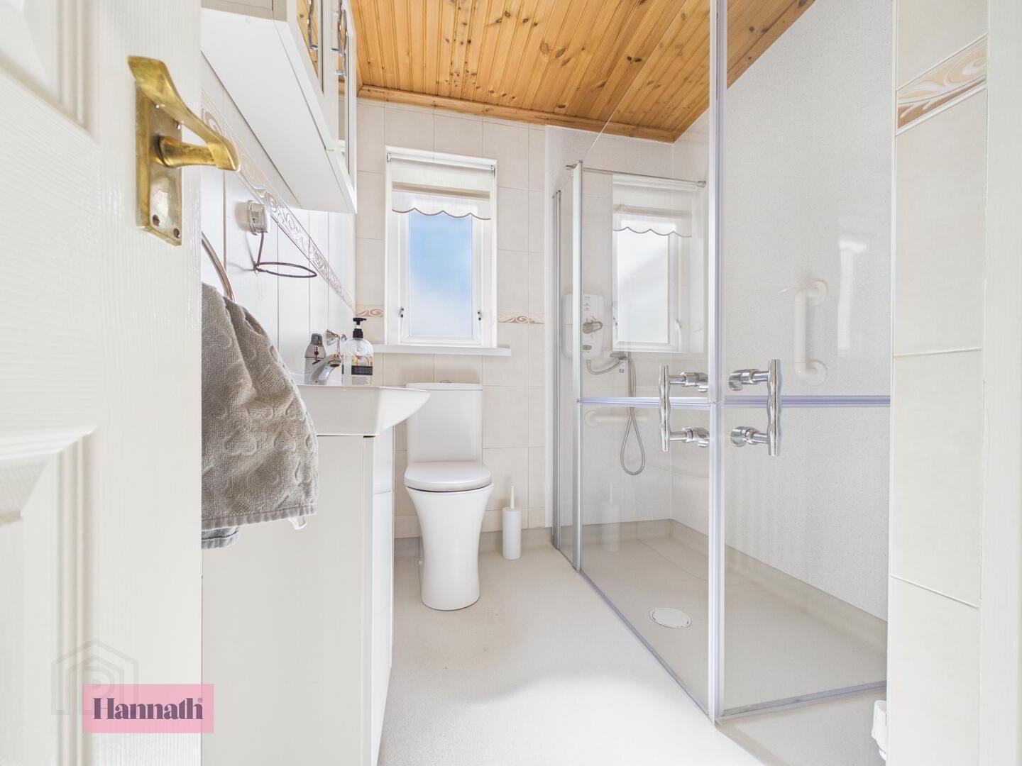 The bathroom is modern and well-appointed, featuring a large shower enclosure with glass doors, a WC, and a wash basin. White walls and natural light create a clean and fresh atmosphere.