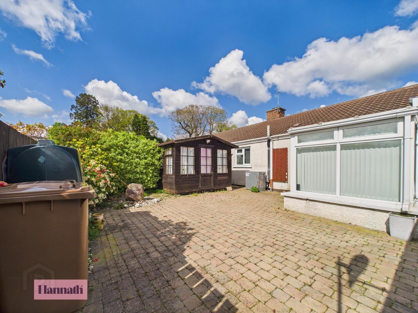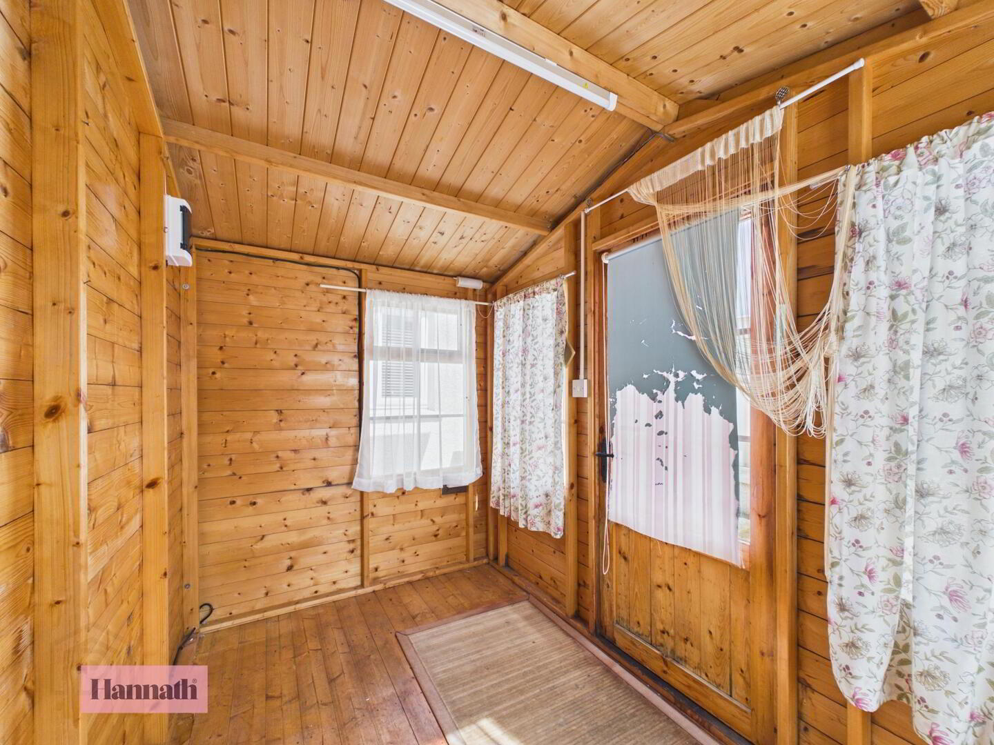The rear garden is a paved courtyard featuring a timber summerhouse and a conservatory that opens onto the space. The area is enclosed and private, ideal for outdoor relaxation or entertaining.