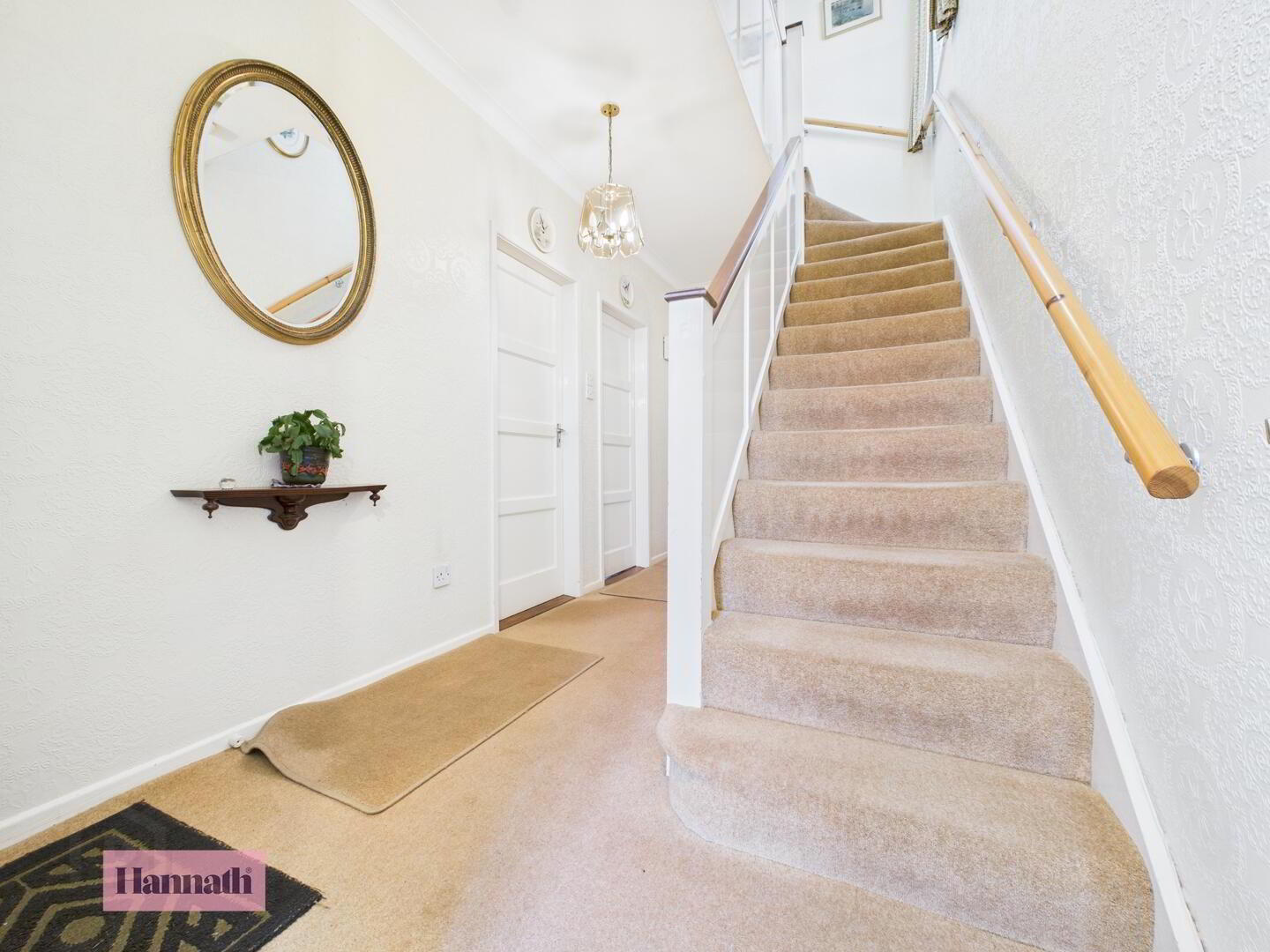 - The landing upstairs is carpeted in a light neutral tone and lit by natural light from a window. It provides access to the bedrooms and bathroom, with white painted doors and simple decor creating a calm and clean space.
