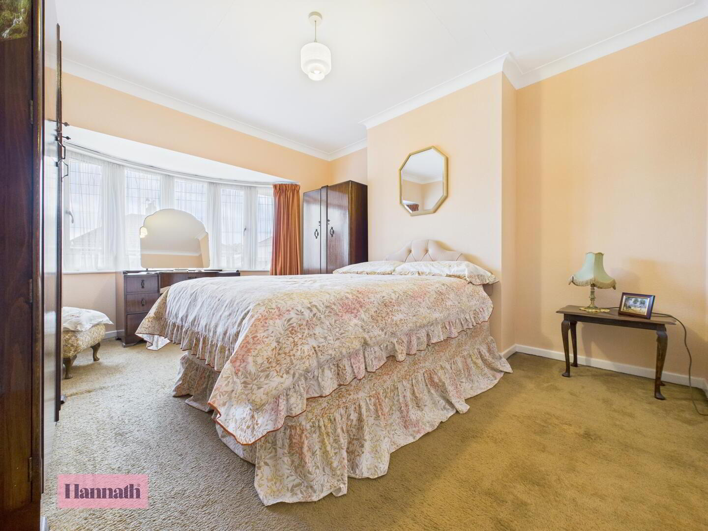 - The main bedroom is a sizeable and inviting space with a large bay window allowing natural light to fill the room. It is carpeted in a warm tone with soft peach walls.