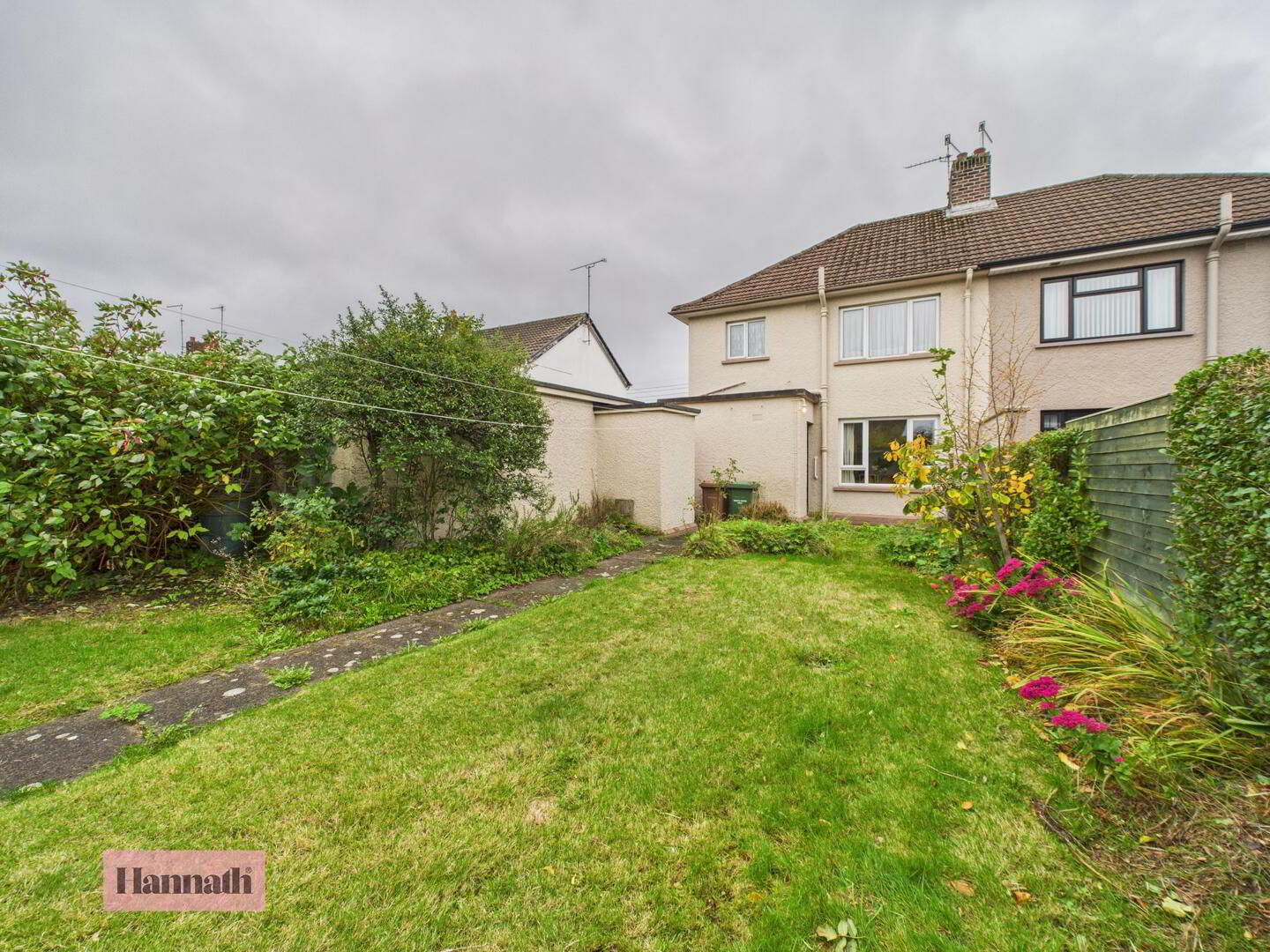 - The rear garden features a well-maintained lawn bordered by mature shrubs and flowering plants. A paved path runs through the garden, which also benefits from a concrete patio area near the house, offering a pleasant outdoor space for relaxation and gardening.