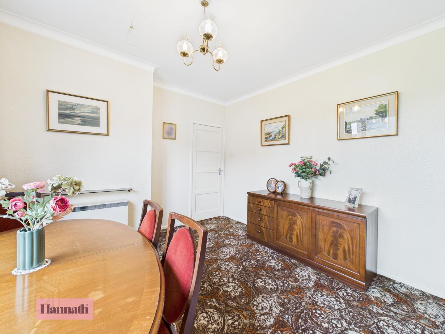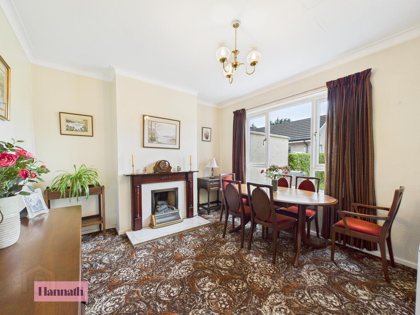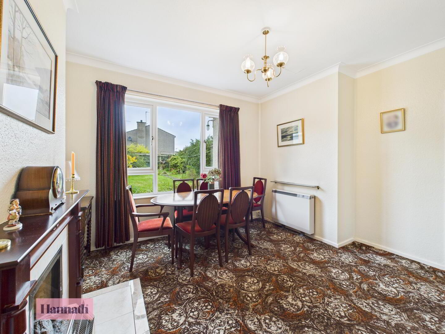 - The dining room offers a peaceful setting overlooking the garden through a large window. It features a patterned carpet and neutral walls, with a classic feature fireplace providing a charming feature. The room is spacious creating a perfect space for family meals and entertaining.