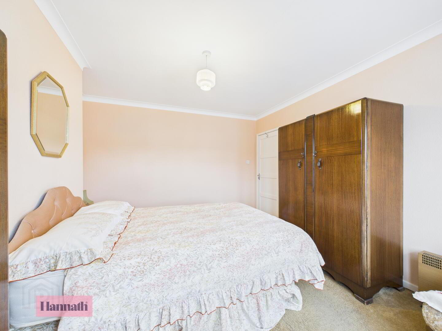 - This bedroom is softly decorated in pale pink walls with light carpeting. It accommodates a double bed