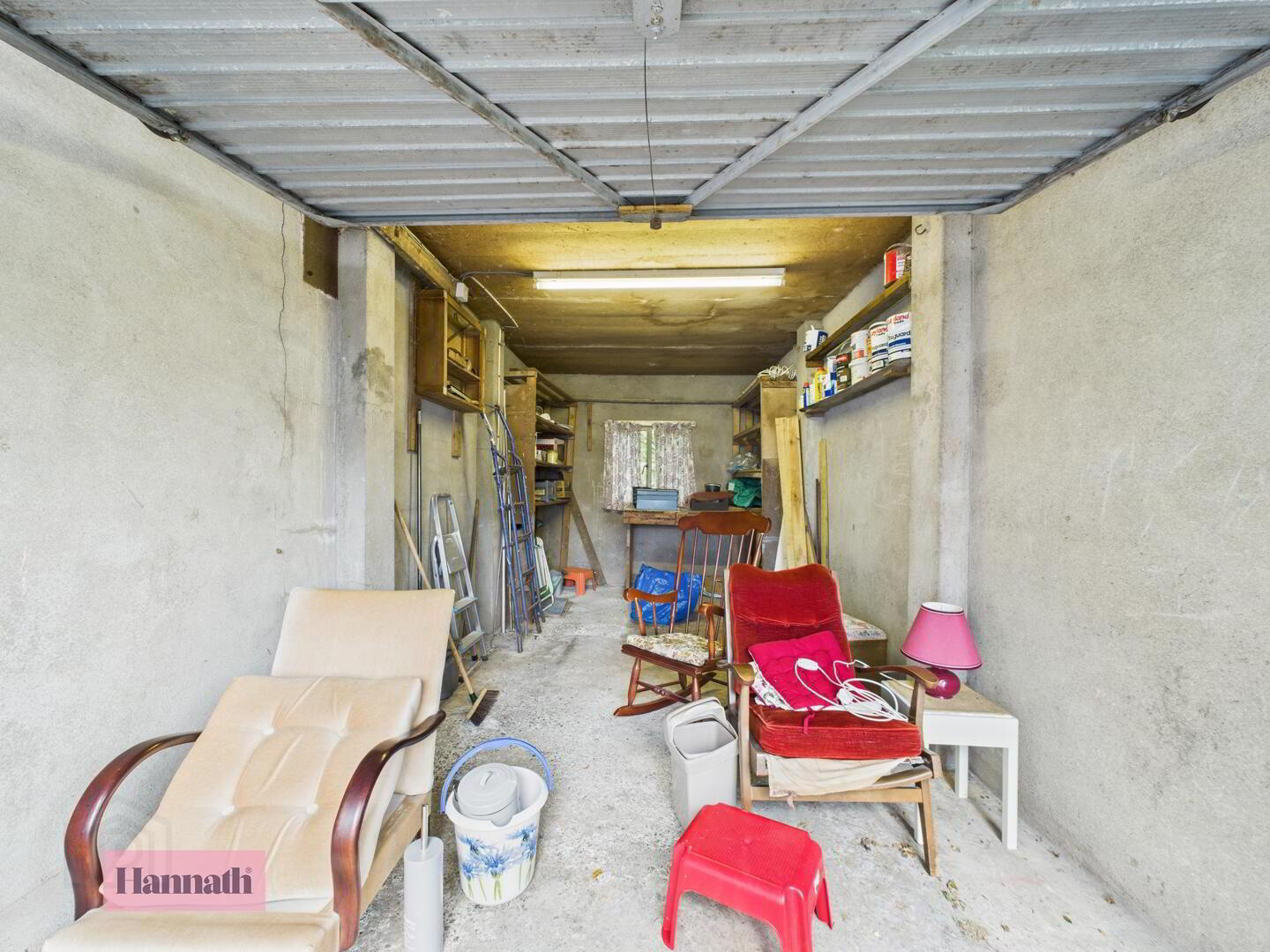 - A detached garage with a brown up-and-over door sits conveniently at the side of the property, providing additional storage space.