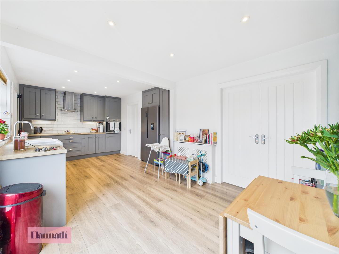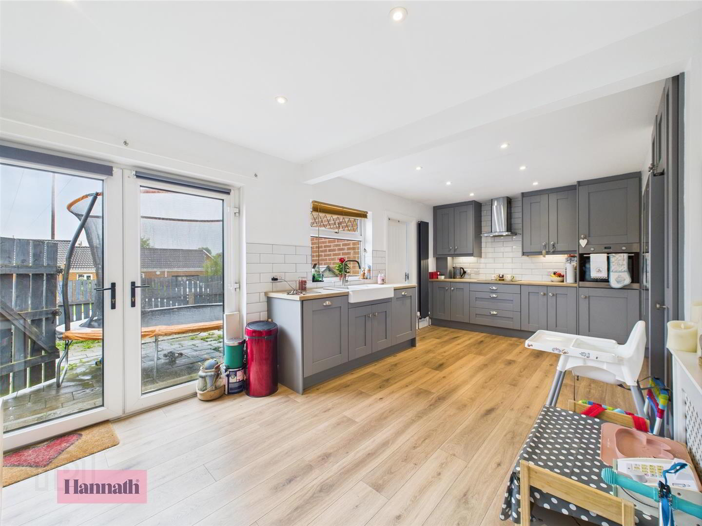 - Range of high and low level units, integrated appliances, wood laminate flooring, wall mounted radiator, patio doors to rear