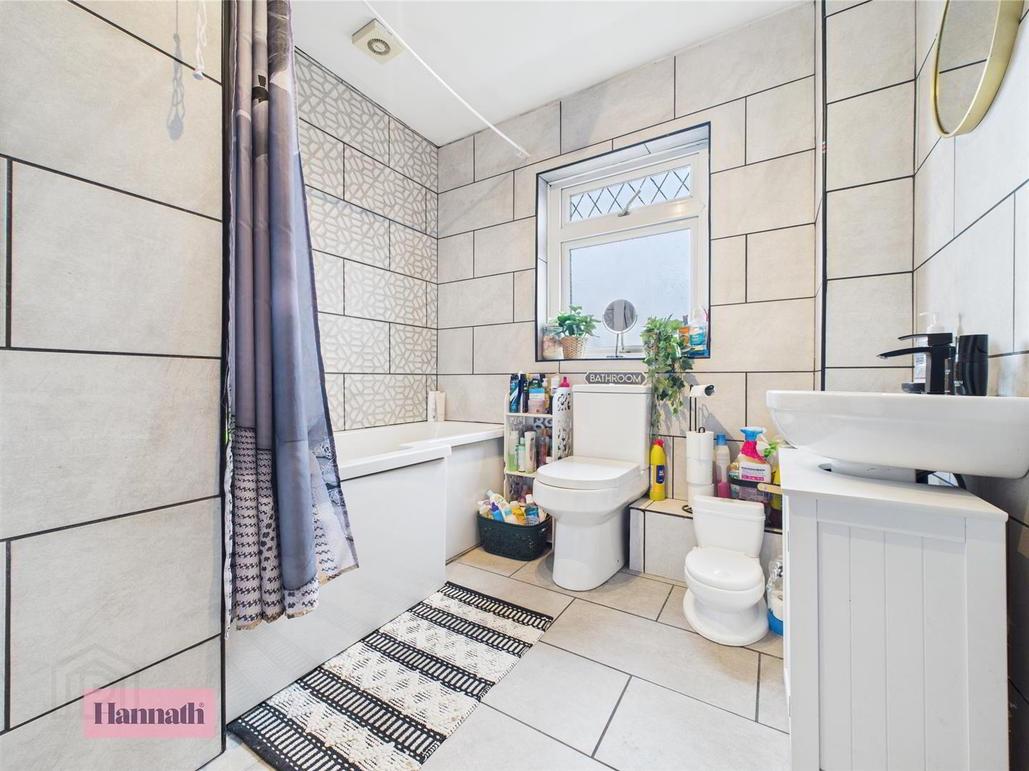 - Three piece bathroom suite comprising shower over bath, wash hand basin, w.c., tiled walls and floors, heated towel rail