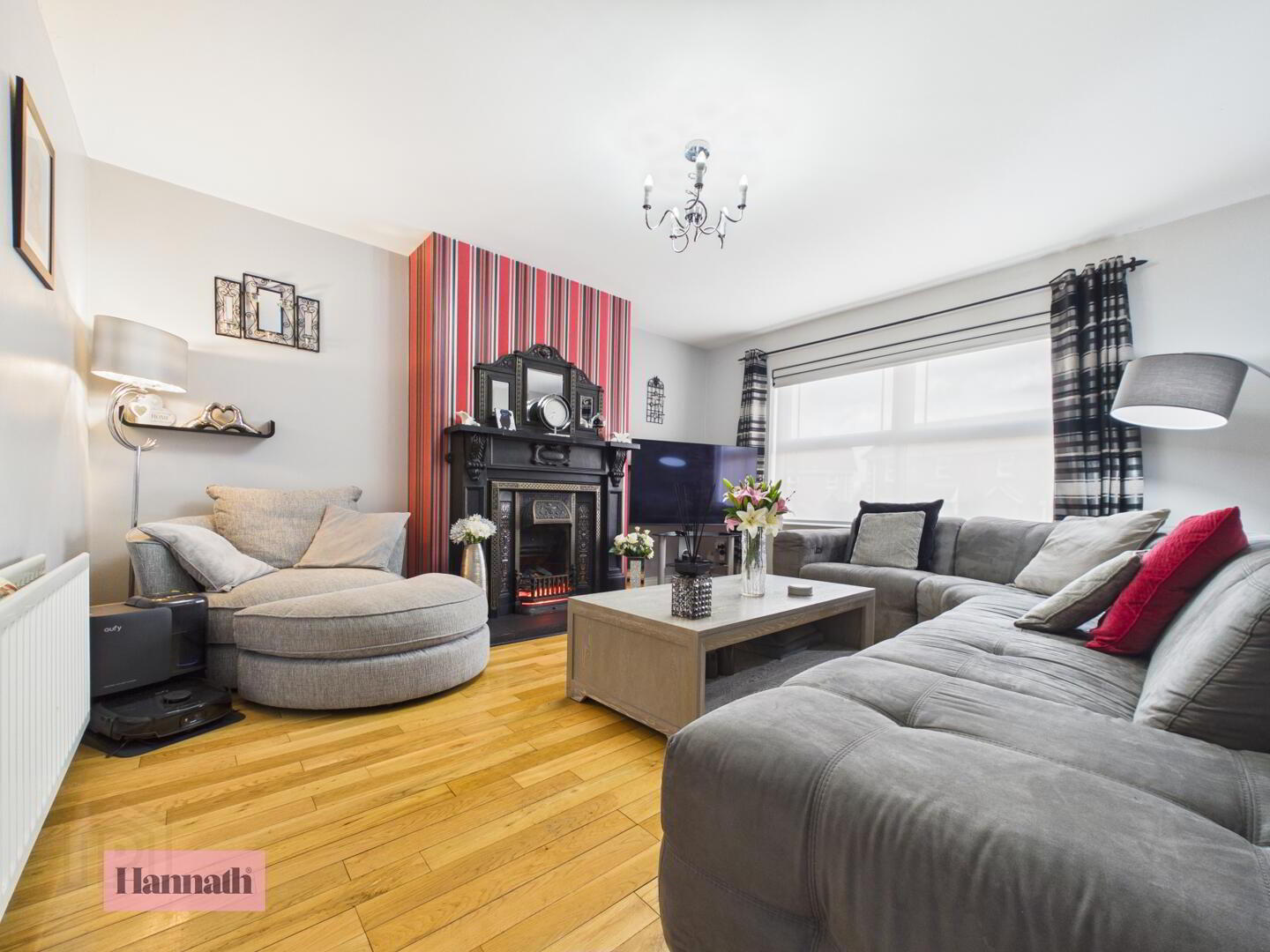 This comfortable living room boasts a large window that floods the room with natural light, highlighting the warm wooden flooring. The room centres around a charming black fireplace with a boldly patterned chimney breast. Ample seating is provided by a generous grey corner sofa and additional armchair.