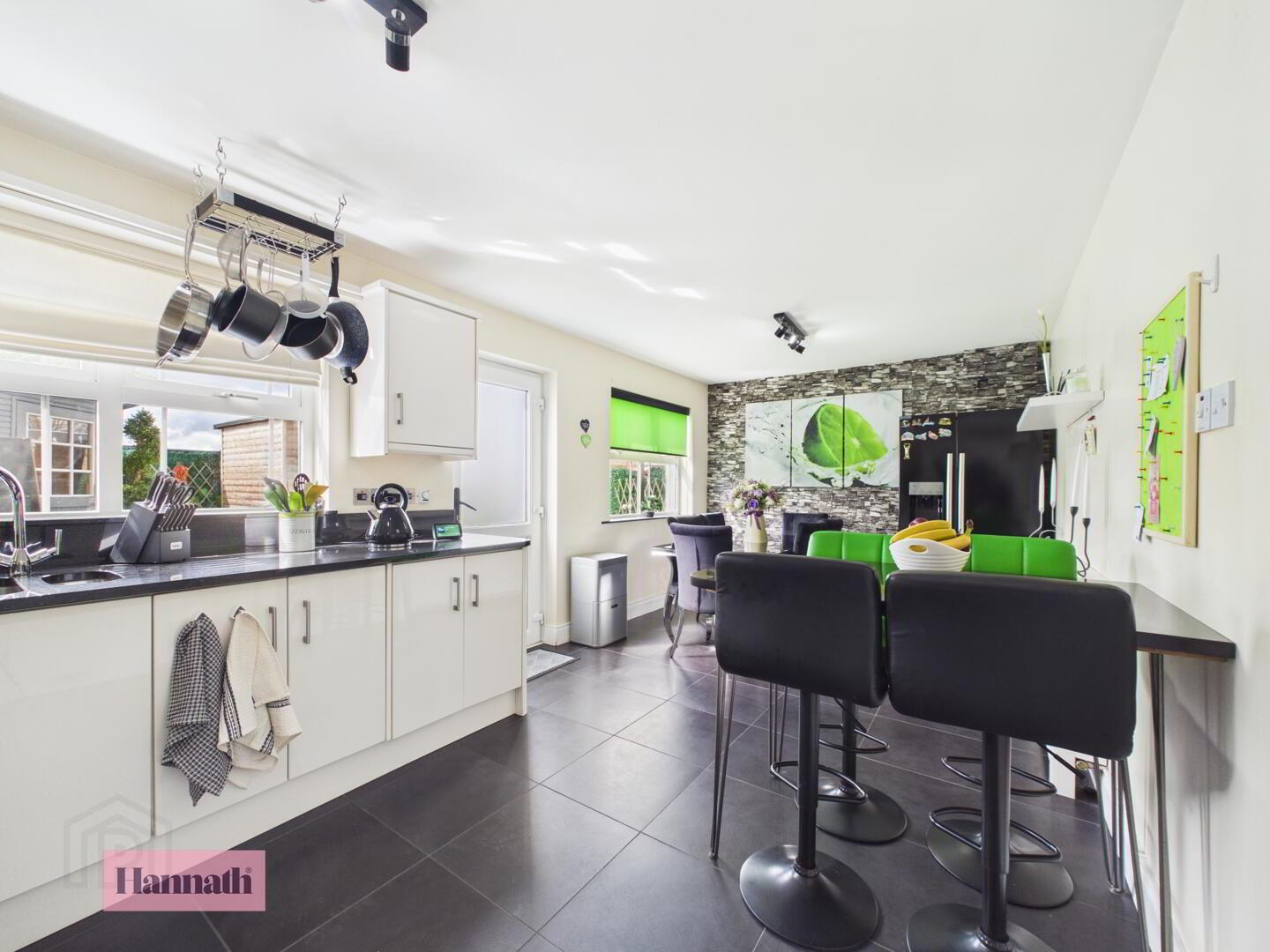 The spacious kitchen and dining area features modern black tiled flooring and is brightened by multiple windows. White cabinetry contrasts with black countertops and integrated appliances.