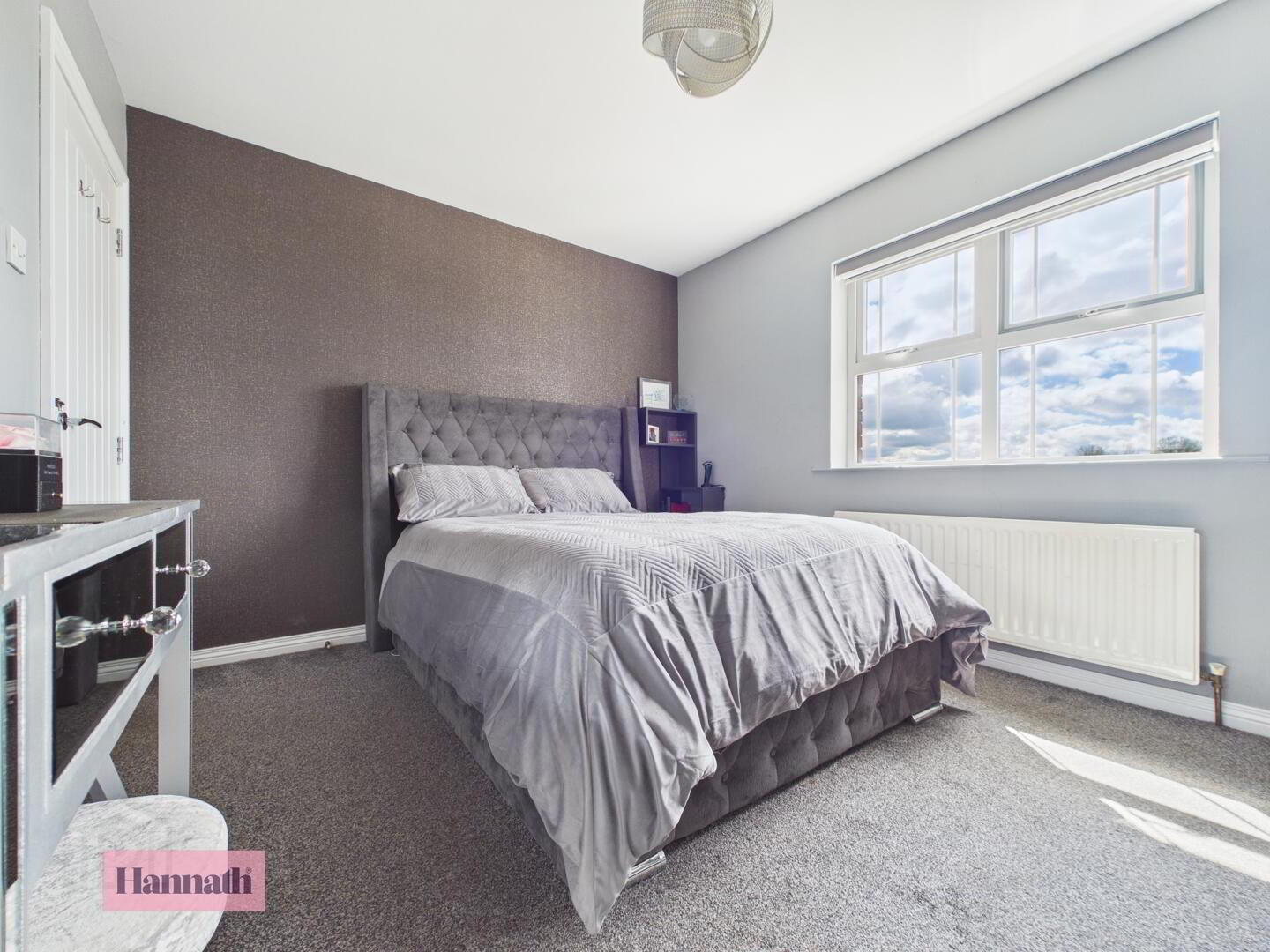 This bedroom is a cosy retreat with a large window allowing plenty of natural light to fill the space. A deep brown feature wall adds warmth and complements the soft grey carpeting. The room comfortably accommodates a double bed and bedside storage units.