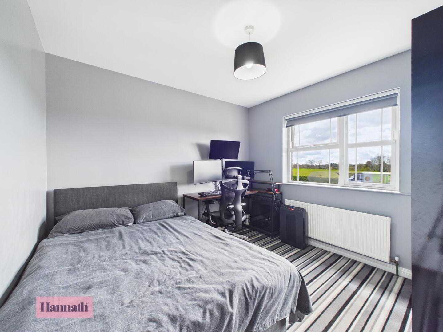 A well-proportioned bedroom that combines comfort with practicality. The soft, striped carpet adds character while the neutral walls make the room feel light and airy. It includes a double bed and a workspace with a desk and chair.