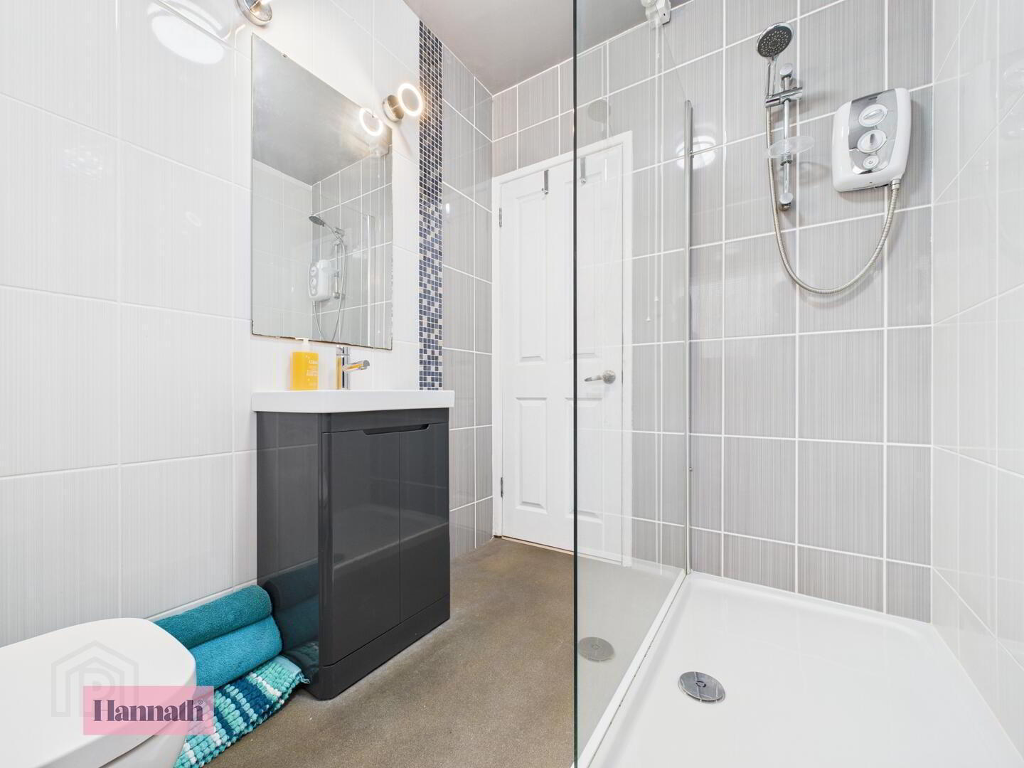 Three piece bathroom, walk in shower, wash hand basin, w.c., tiled walls, extractor fan, heated towel rail