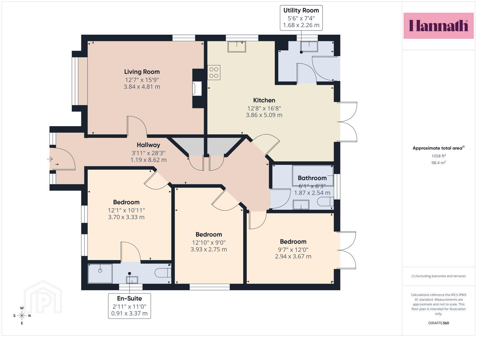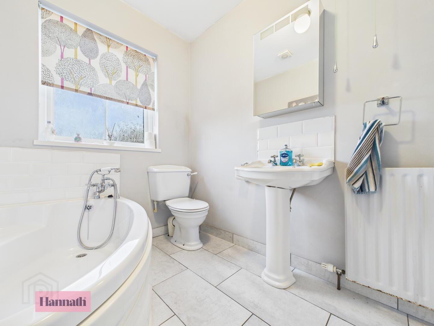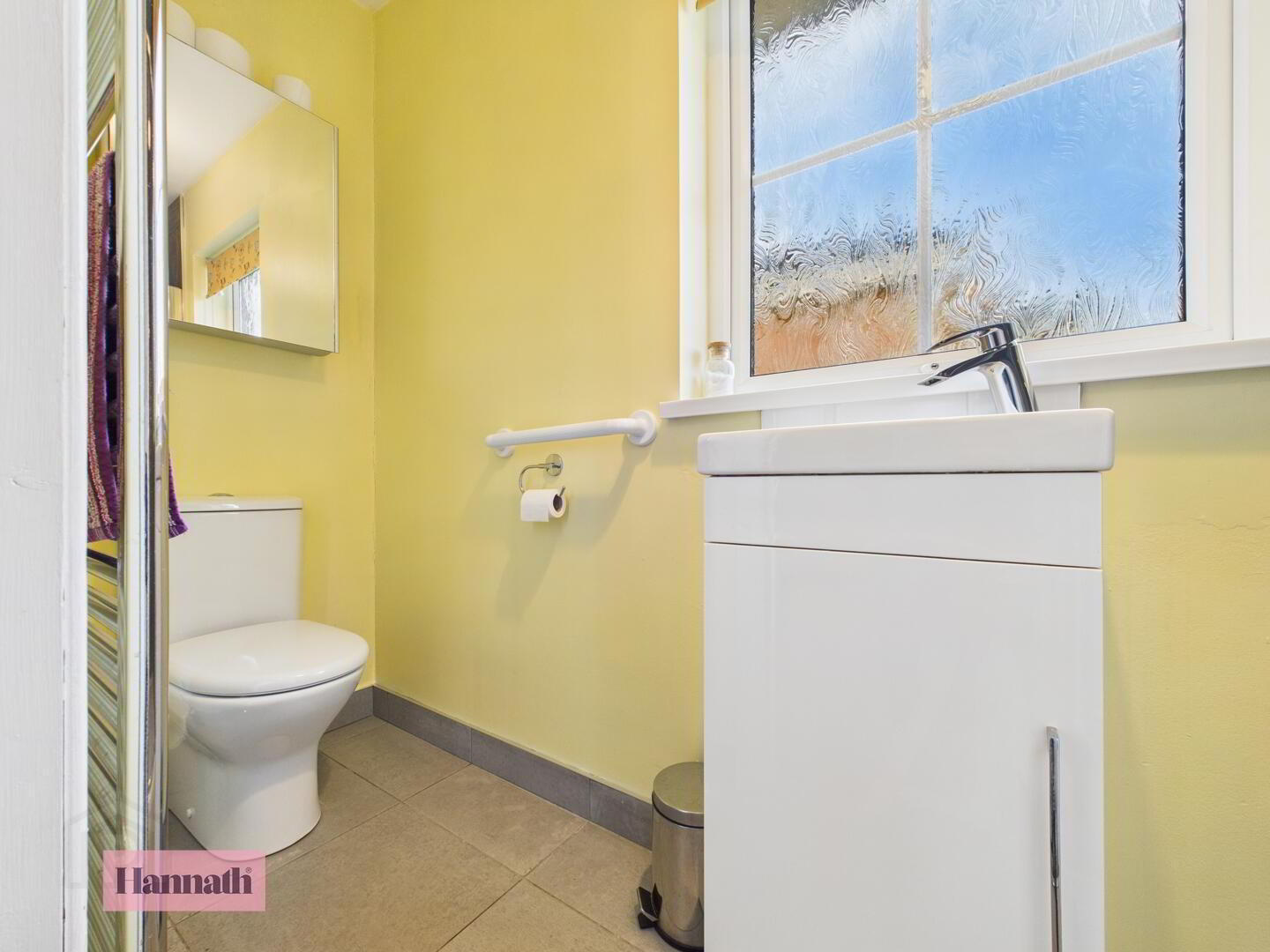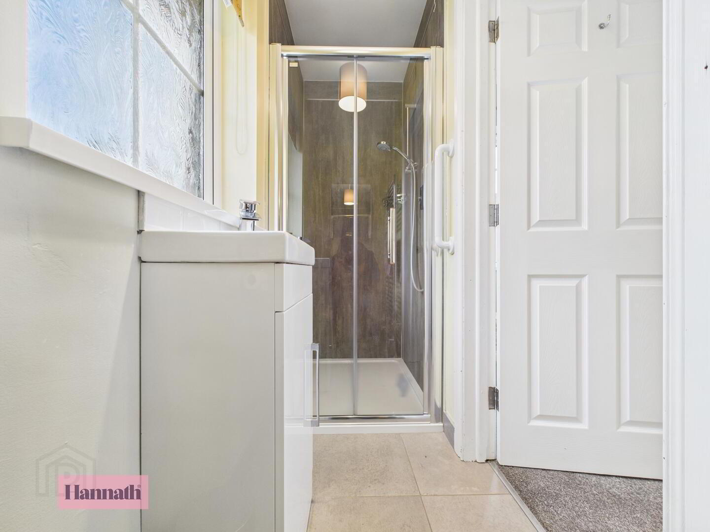 Three piece suite comprising of; WC, wash hand basin, shower, tiled flooring and heated towel rail.
