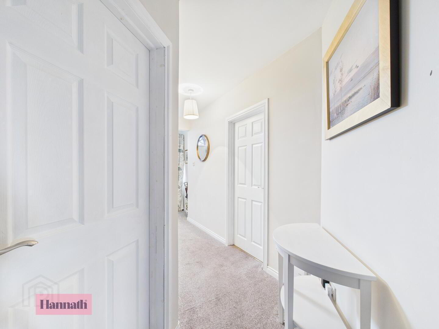 Entrance via solid wooden door with stained glass fan widow above and glass panels either side, carpet, access to shelved hot press and cloak room.