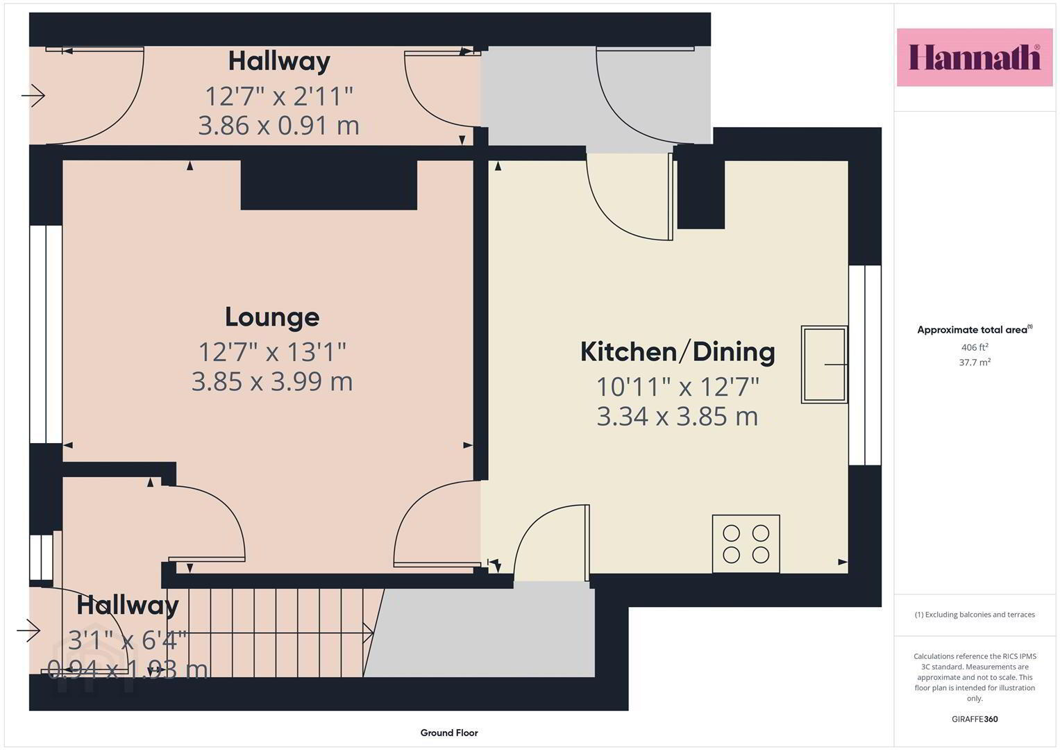 Hallway 12' 7'' x 2' 11'' (3.83m x 0.89m)