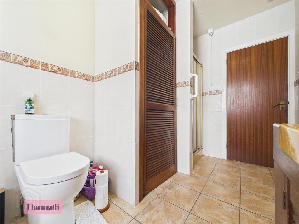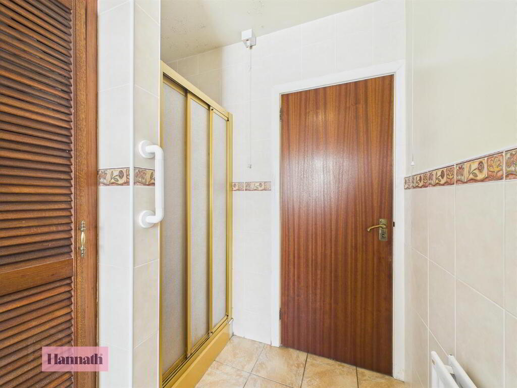 Four piece suite comprising of shower, bath, wash hand basin and w.c., tiled walls, tiled flooring, double panel radiator, hot press