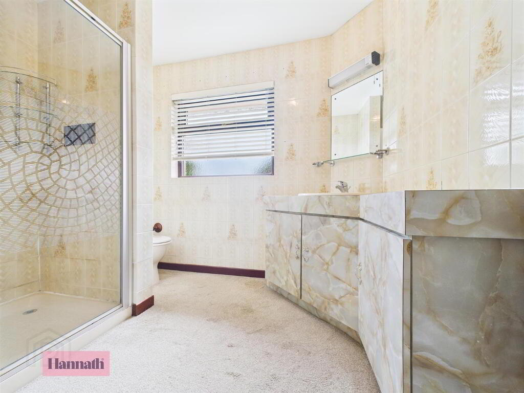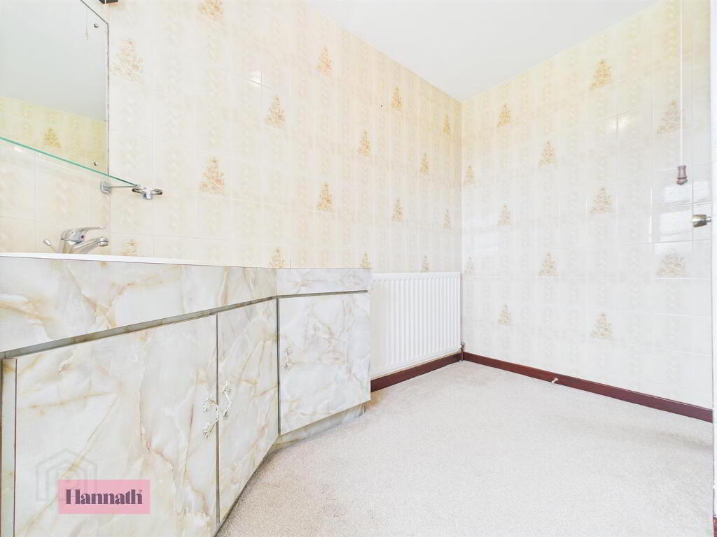 Three piece bathroom suite comprising of; low flush WC, wash hand basin with built in storage and mains shower. Carpet flooring and fully tiled walls. Single panel radiator.