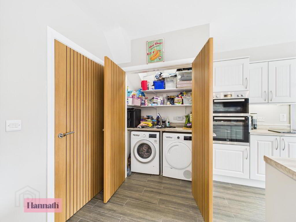 Range of high and low level units with hard wearing worktop with stainless steel 1.5 sink with mixer tap. Integrated fridge/freezer, hob, double oven and dishwasher. Access to utility area where there is plumbing for washing machine and space for tumble dryer. Access to rear garden via; PVC double doors.
