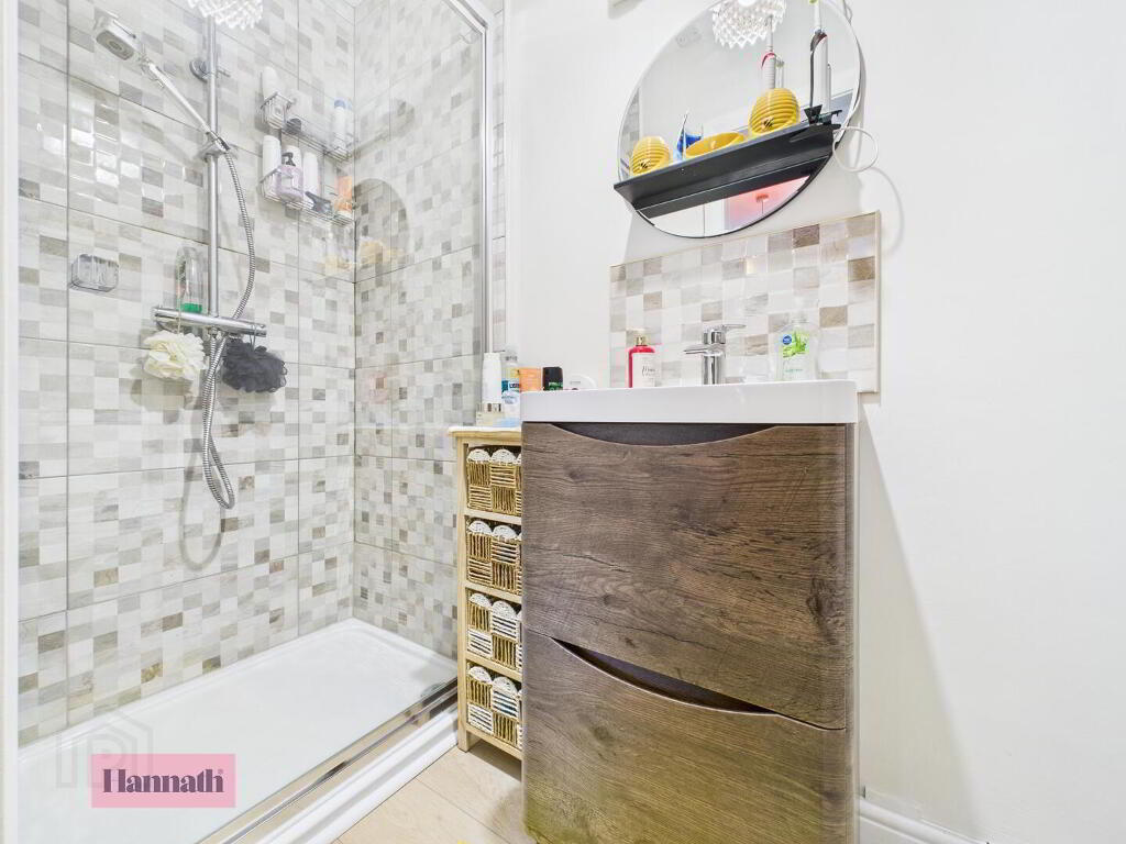 Three piece suite comprising of; low flush WC, wash hand basin with vanity unit and mains shower with dual drencher shower head. Tiled flooring, splash back and shower enclosure. Heated towel rail.