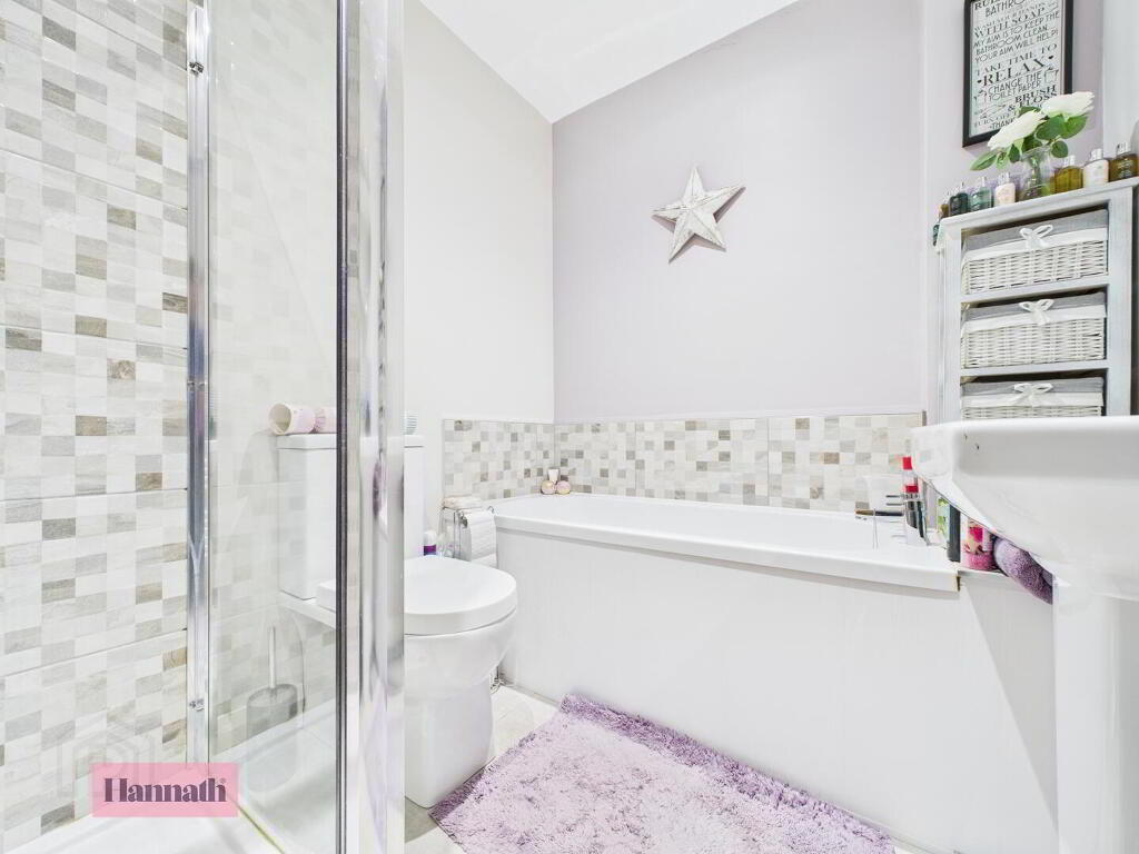 Four piece bathroom suite comprising of; low flush WC, wash hand basin, fitted bath and mains shower. Tiled flooring, splash back and shower enclosure. Heated towel rail.