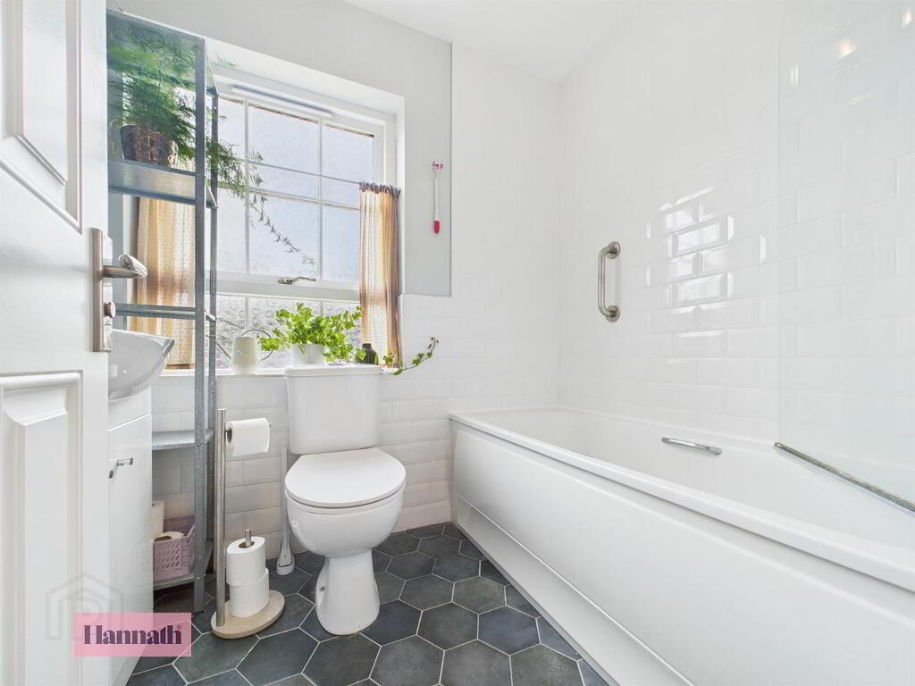 Three piece suite comprising shower over bath, wash hand basin, w.c., part tiled walls, heated towel rail