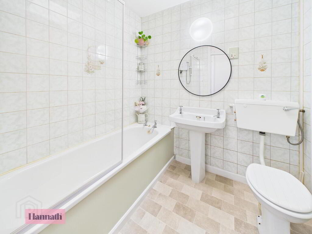 Three piece bathroom suite with electric shower over bath, wash hand basin, w.c., tiled walls, vinyl flooring, radiator