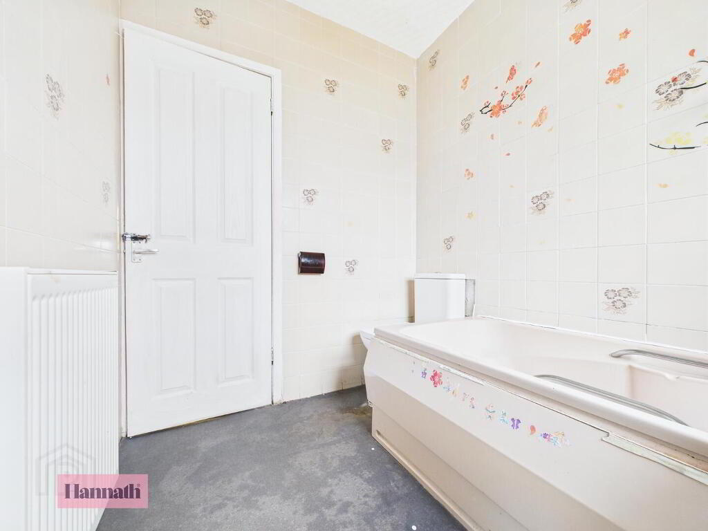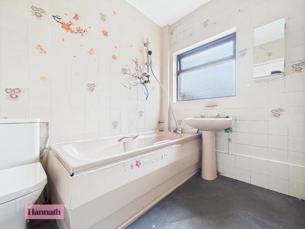 Three piece suite comprising of; panel bath, WC & pedestal wash hand basin. Tiled walls.