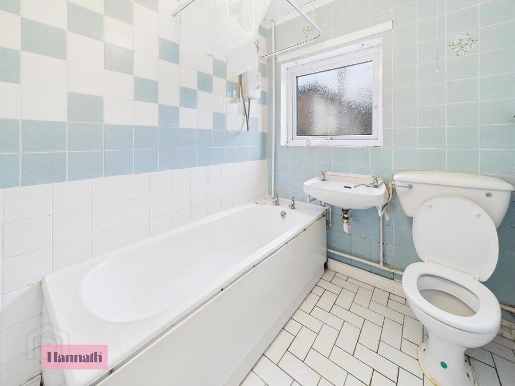 Tile flooring. Tile walls. Three piece bathroom suite. Single panel radiator.