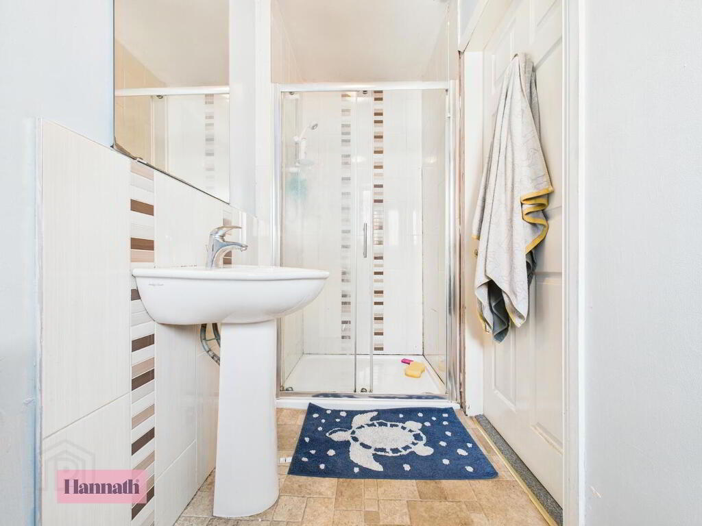 Mains Shower Enclosure. Low Flush WC. Pedestal Wash Hand Basin. Partially Tiled.