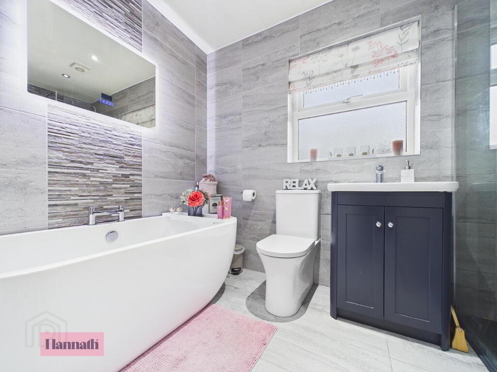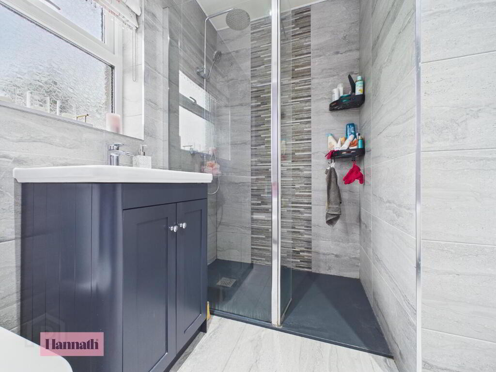 - Modern Four Piece Suite. Shower Enclosure. Bath,. Low Flush WC. Pedal Wash Hand Basin. Tiled fully.