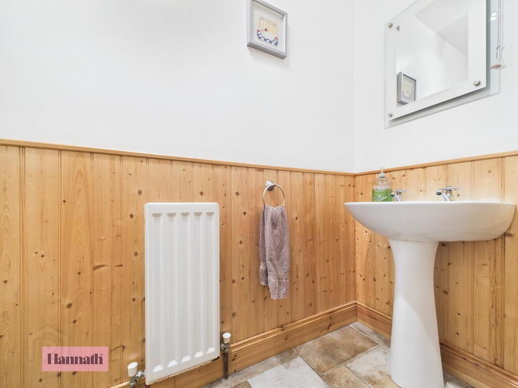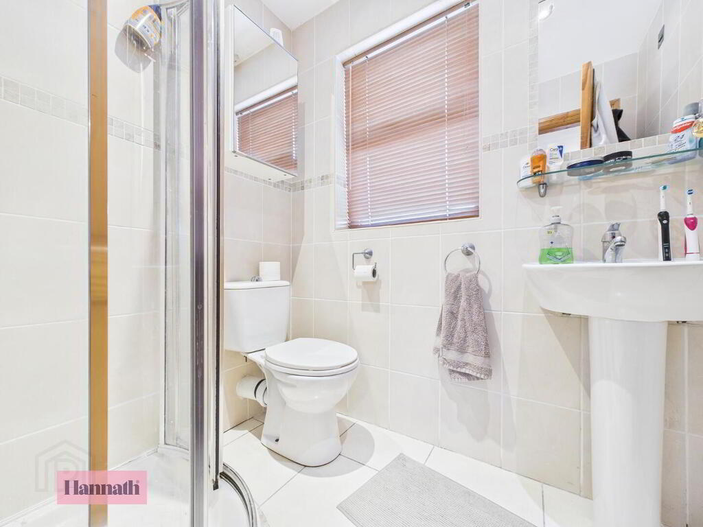 Fully tiled, Low flush WC, pedestal wash hand basin with tiled splashback, shower enclosure