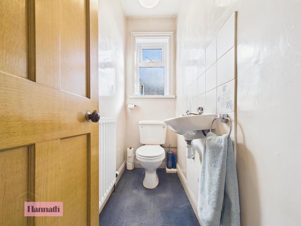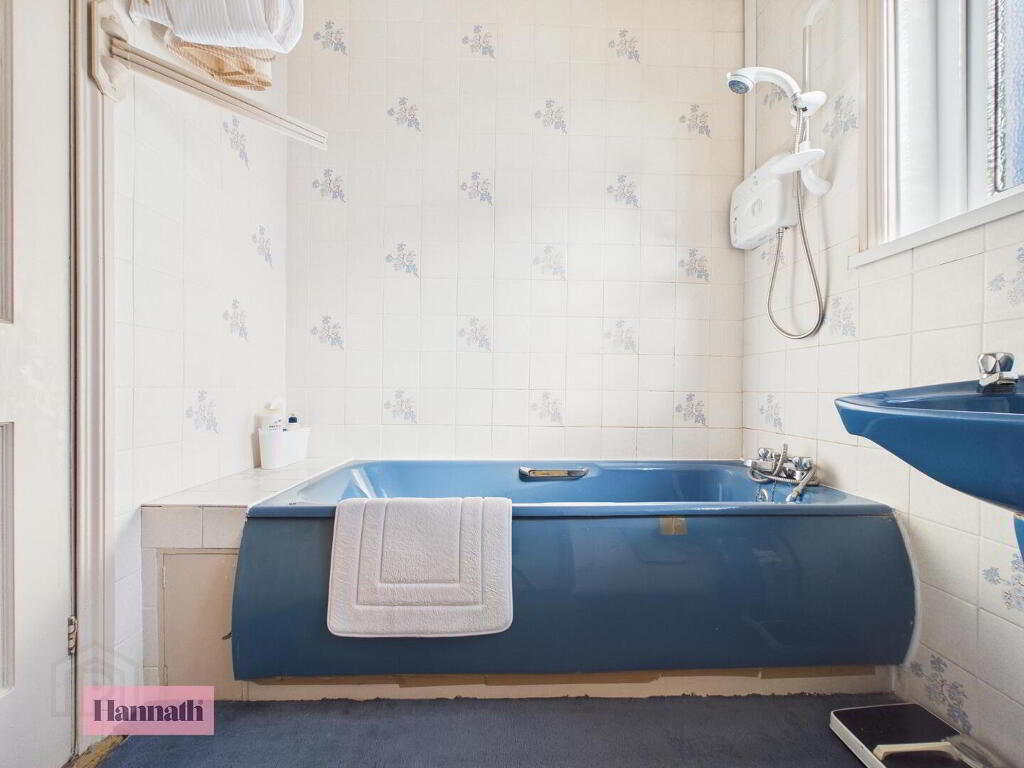 - Bath, wash hand basin, radiator, carpet, tiled walls