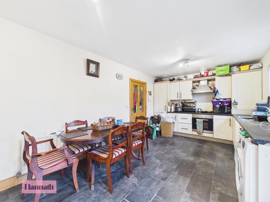 The kitchen and dining area offer a practical and sizeable space for cooking and family meals. The kitchen features high & low units finished in a light colour, integrated appliances including an oven and extractor, and ample work surfaces. The dining area comfortably accommodates a table and chairs, with room to move freely. A side door leads out to the rear garden, allowing easy access for outdoor dining or entertaining. The floor is finished with dark tiles.
