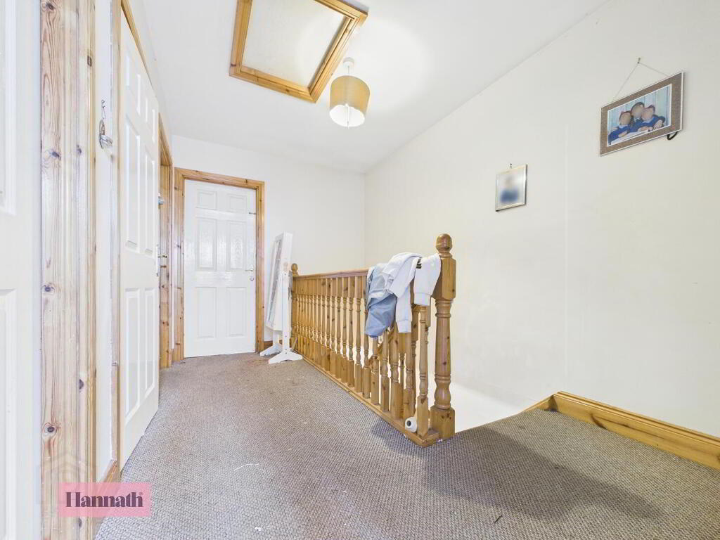 The landing is a light and airy space on the first floor, carpeted in a neutral tone. It features a wooden balustrade overlooking the stairwell and gives access to all three bedrooms and the bathroom.