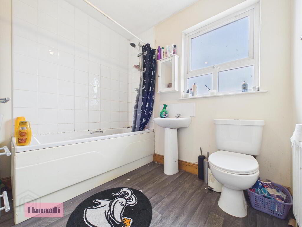 The first-floor bathroom is fitted with a white suite including a bath with an overhead shower, a pedestal sink, and a toilet. The walls are tiled around the bath area with light tiles, and the flooring is finished in a wood-effect laminate.