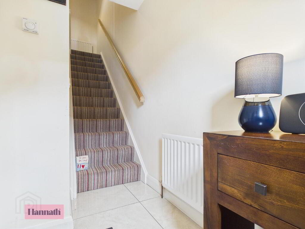 - This welcoming entrance hall is bright and practical, featuring tiled flooring and a neutral palette that sets a fresh tone upon entry. A wooden stairway with a striped carpet runner leads comfortably to the upper floor.