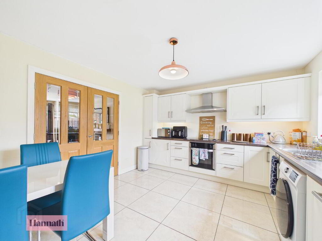 - The kitchen is bright and modern with a clean, streamlined design. It features a range of units with integrated appliances, including an oven and space for a washing machine. Large windows overlook the garden, allowing for plenty of daylight. The space comfortably accommodates a dining table with seating for four, set against tiled flooring for practicality.