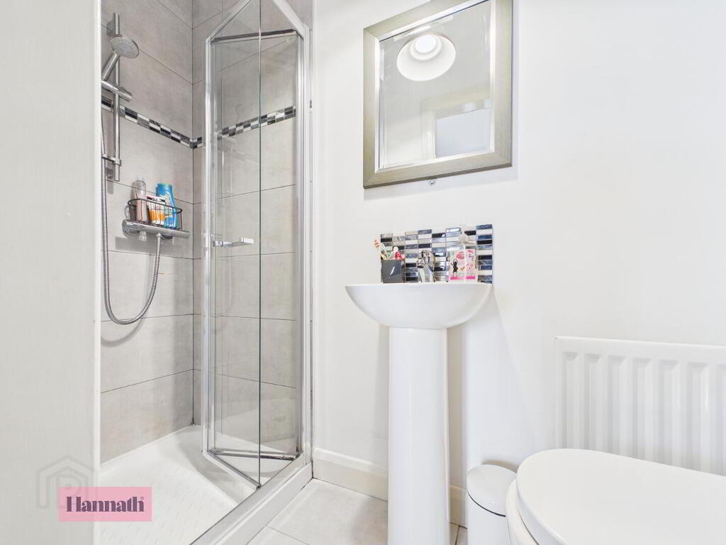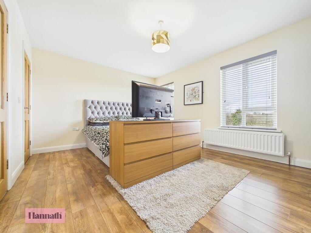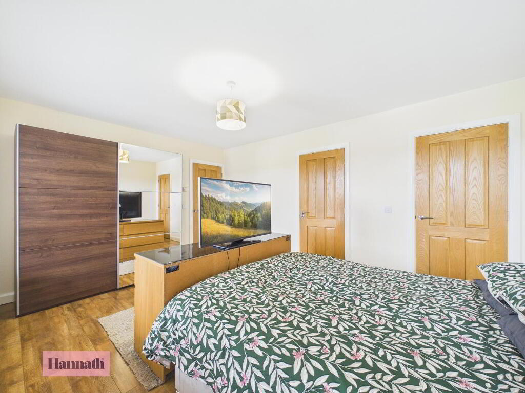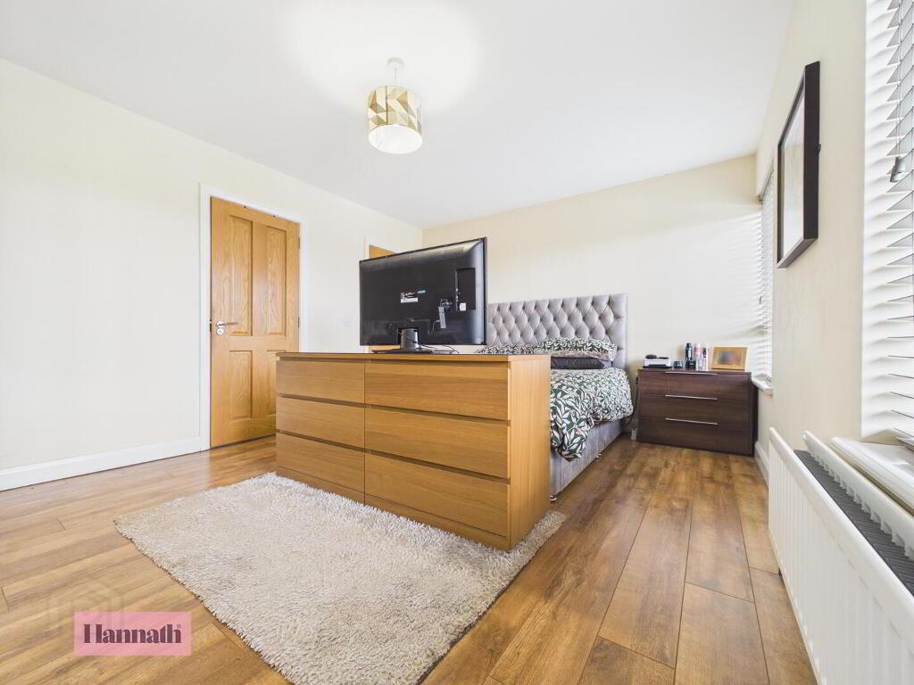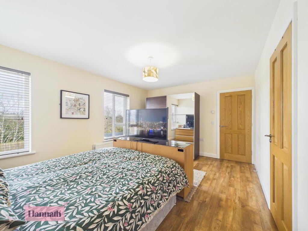 - The master bedroom is a generously sized room with two windows that draw in ample natural light. It features wood-effect flooring and neutral walls, presenting a calm and restful atmosphere. There is plenty of space for a large bed and additional furniture, with a built-in wardrobe providing storage. The ensuite bathroom is fitted with a modern shower cubicle, wash basin, and toilet, finished in light tiles for a fresh look.
