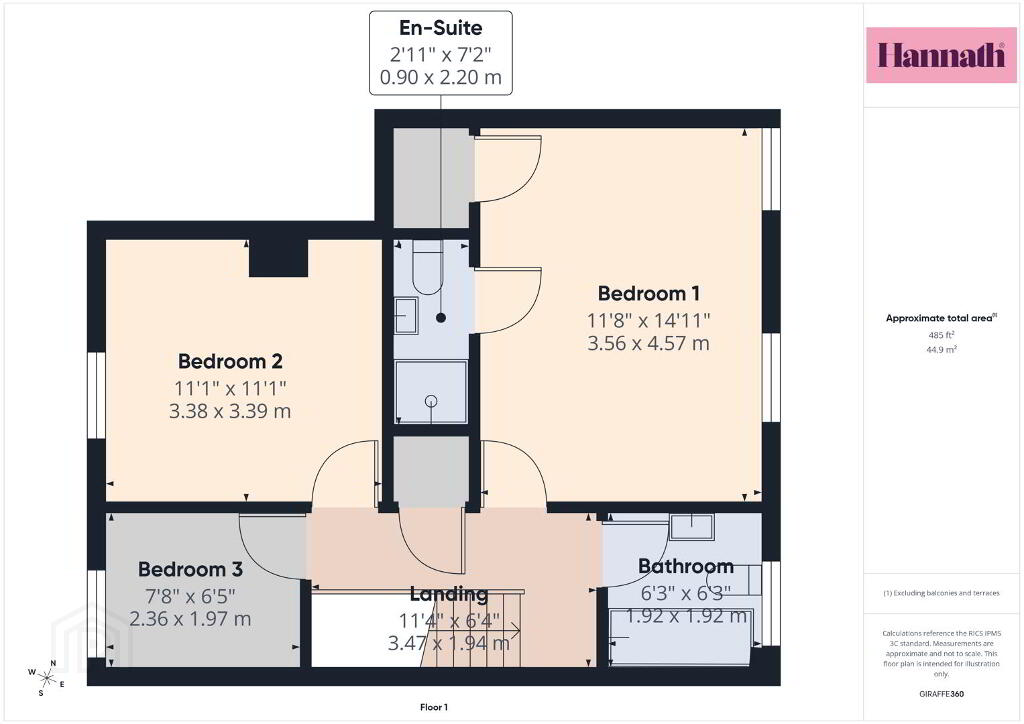 - The landing area on the first floor is carpeted with a striped runner and offers access to all bedrooms, the bathroom, and the stairs leading down. It is painted in a soft cream shade with natural light welcoming you in.