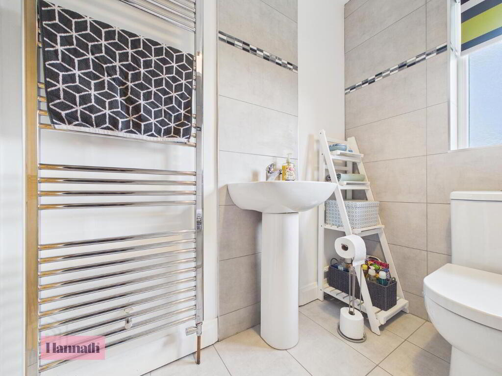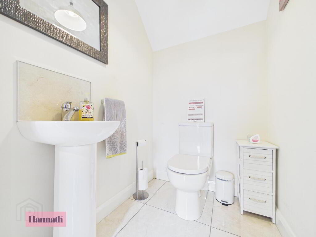 - A compact and neat WC on the ground floor features contemporary fittings including a pedestal basin and a toilet, finished with light tiling and a neutral décor for a fresh and clean feel.