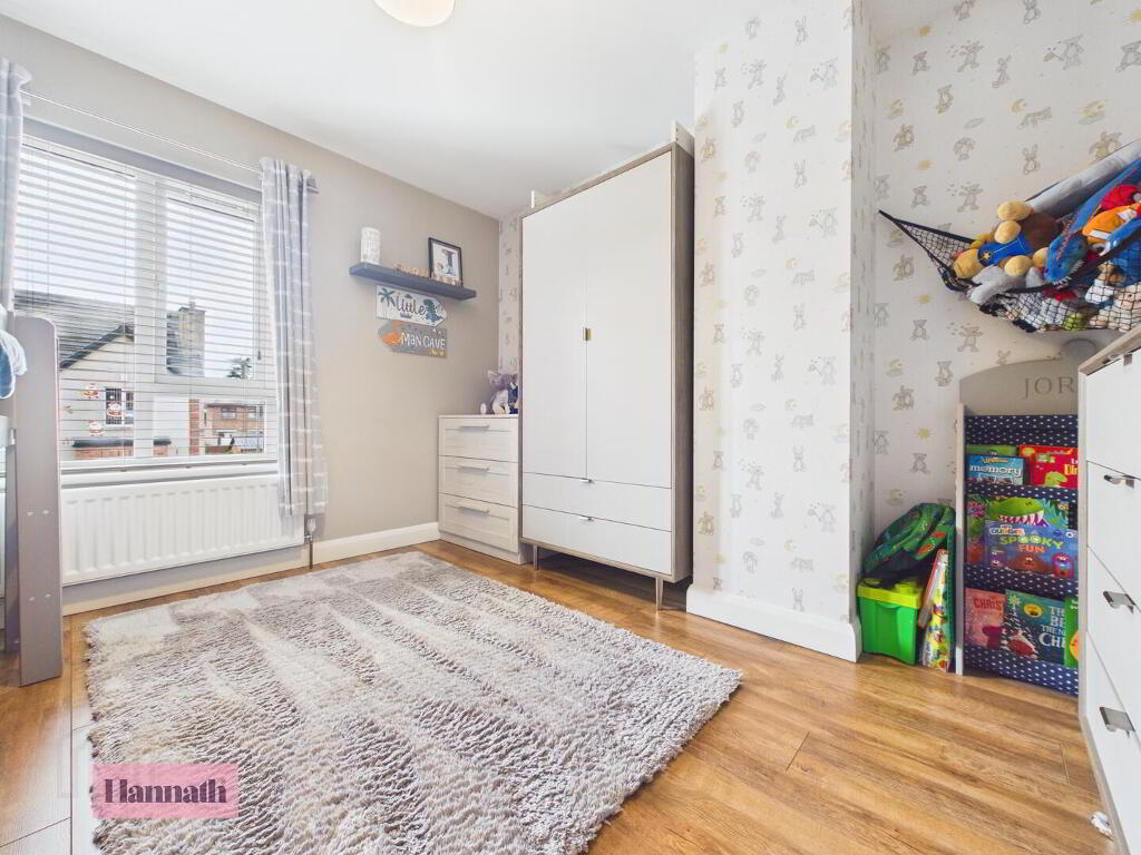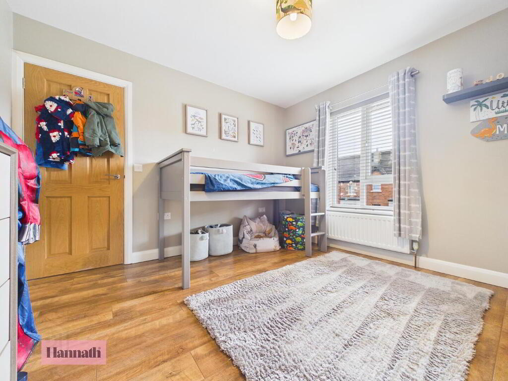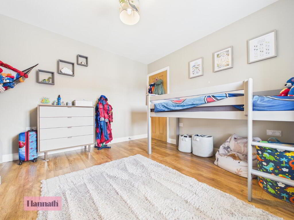 - The third bedroom is a smaller room that works well as a child’s bedroom or study. It features wood-effect flooring and a lively décor with patterned wallpaper and bright furnishings. A window allows natural light to stream in, making it a cheerful space.