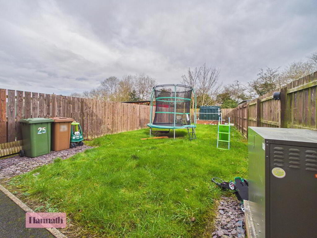 - The rear garden offers a generous, enclosed lawn space that is ideal for children or pets to play safely. It is bordered by wooden fencing and includes a paved pathway along one side, with ample room for outdoor activities and garden furniture.